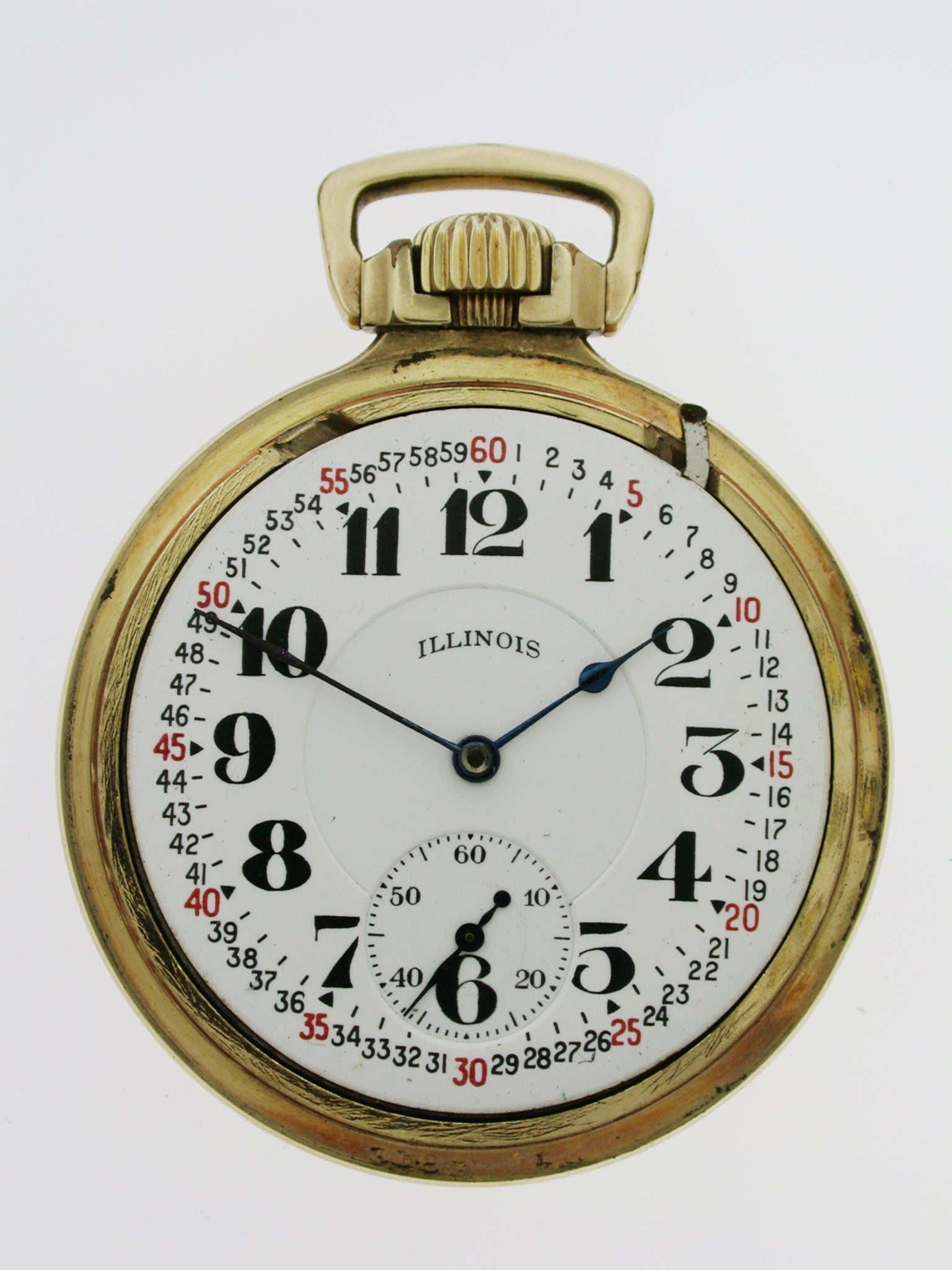 Dial: The white enamel dial has thick black Arabic numerals with outer minute divisions. The dial has blued hands and a subsidiary second’s dial at the six. The dial is signed in the upper centre “Illinois”.