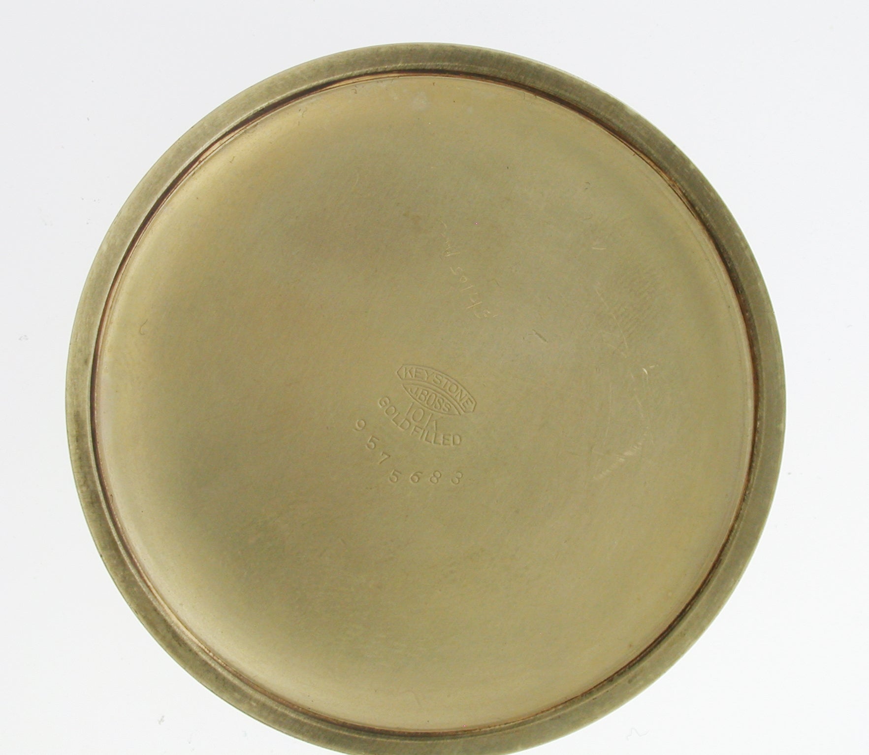 Case: The watch lies in a gold-filled open-face case with a screw back front and a smooth finished back. The inner side of the case is signed “Keystone J. Boss, 10K, Gold filled” and numbered 9575683.