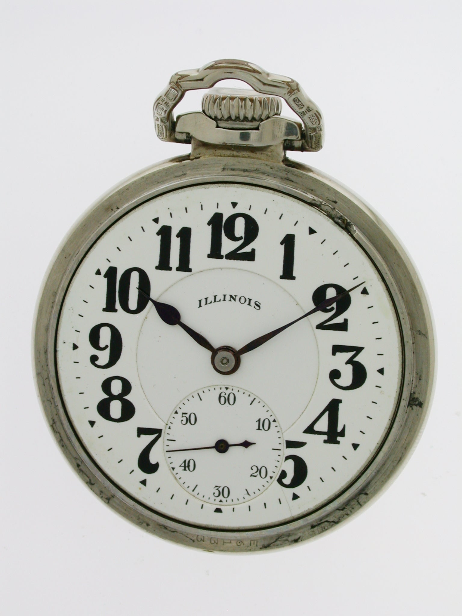 Dial: The white enamel dial has thick black Arabic numerals with outer minute divisions. The dial has blued hands and a subsidiary second’s dial at the six. The dial is signed in the upper centre: “Illinois”.