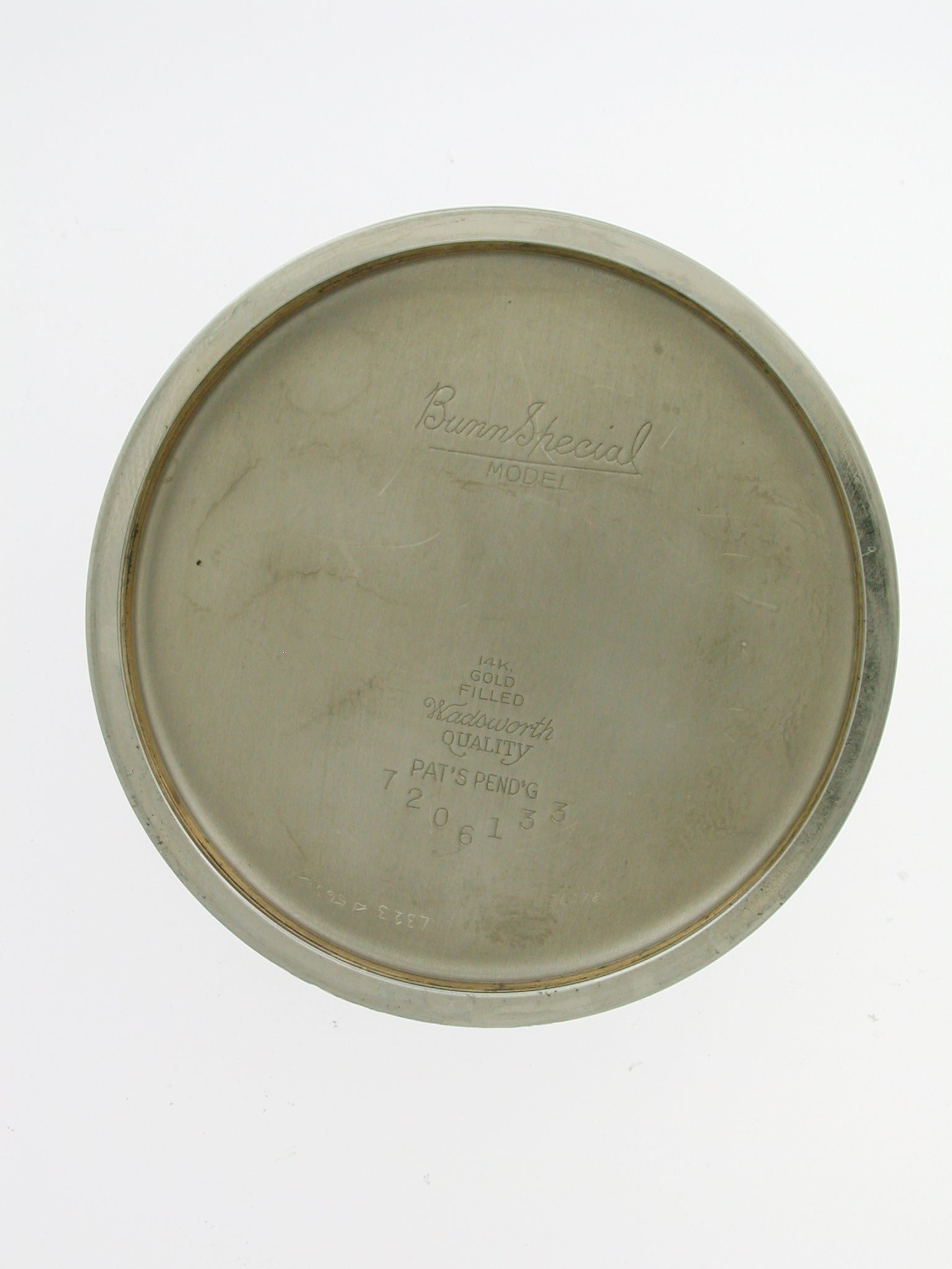Case: The watch lies in a steel open-face case with a screw case front and a smooth finish back. The inner side of the case is signed: “Bunn Special Model 14K Gold-filled Wadsworth Quality Pat’s Pend’g” and numbered 7206133.