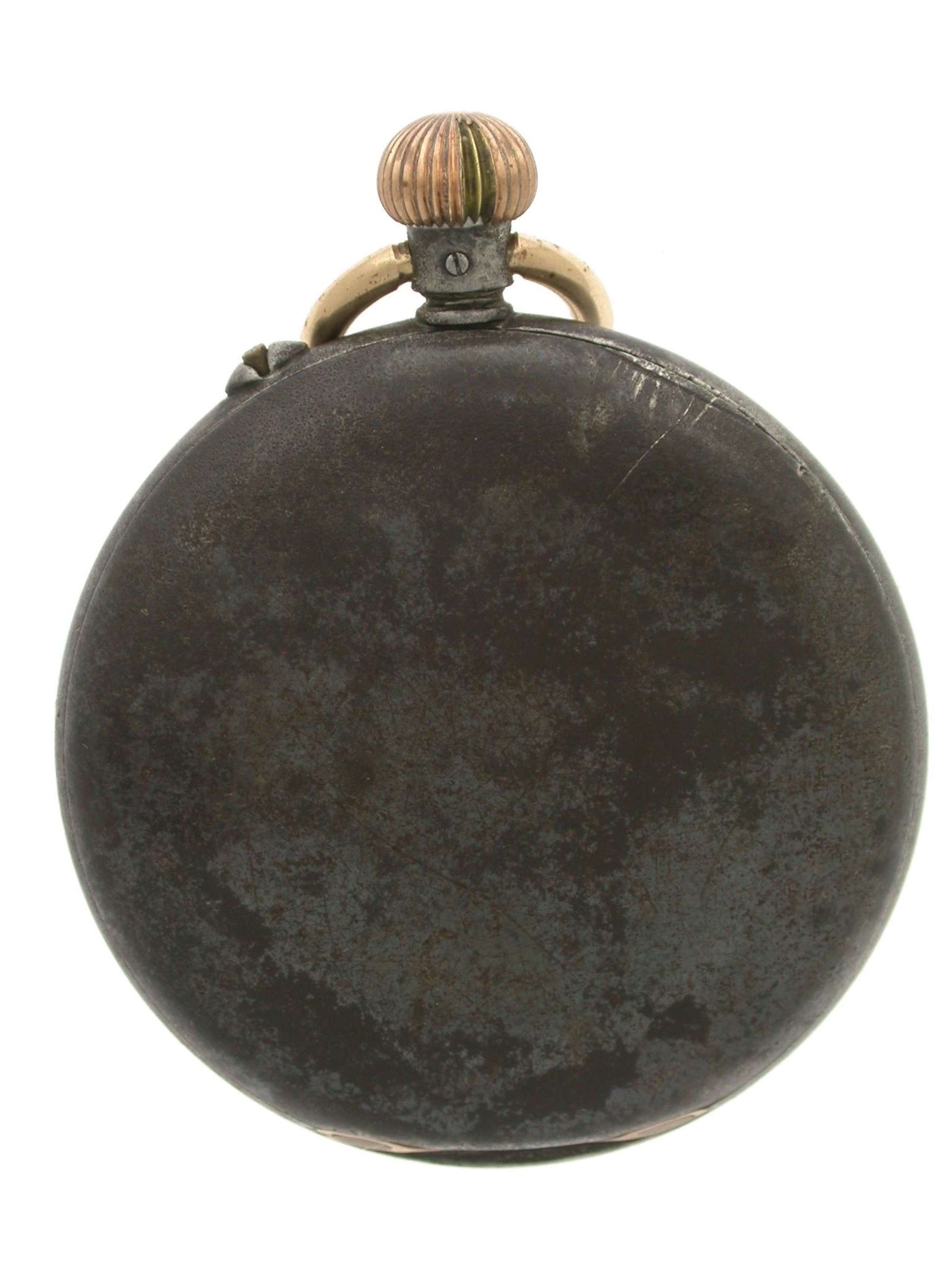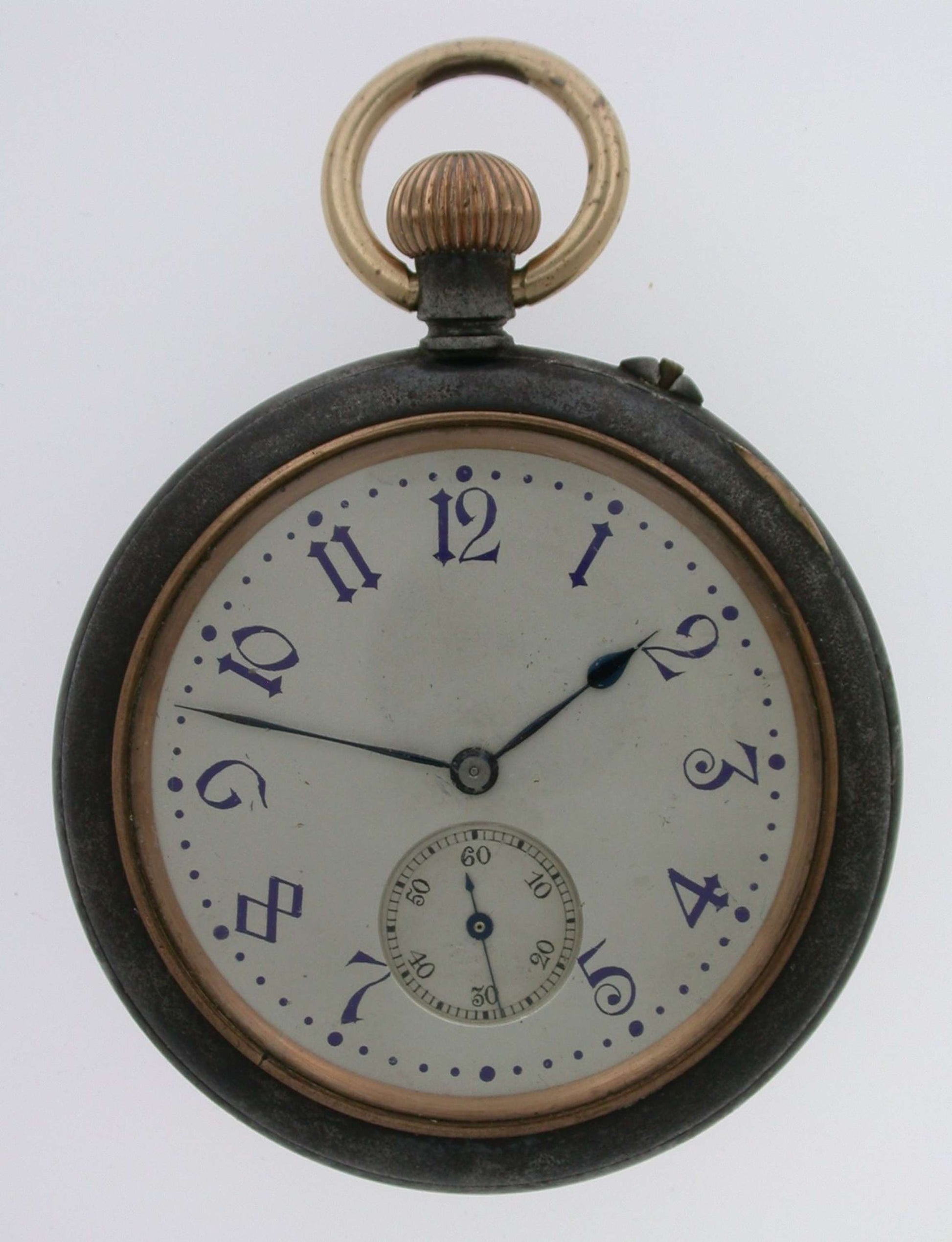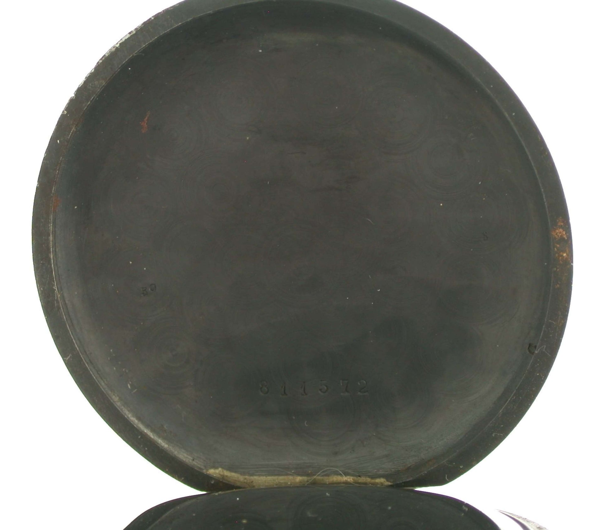 Case: The watch lies in a gunmetal open face case with a smooth finish. The inner side of the case is numbered: 811572.