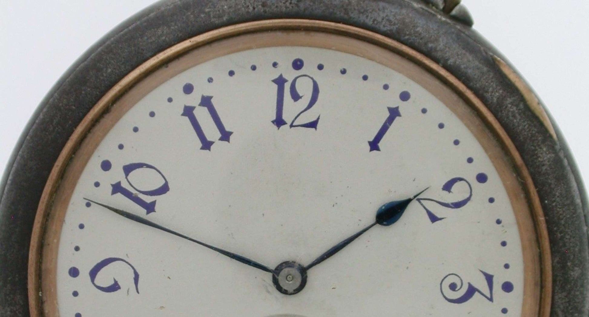 Dial: The pearl-coloured silvered dial has blue Art Nouveau style Arabic numerals with outer minute divisions. The dial has blued fine hands and a subsidiary second’s dial at the six.