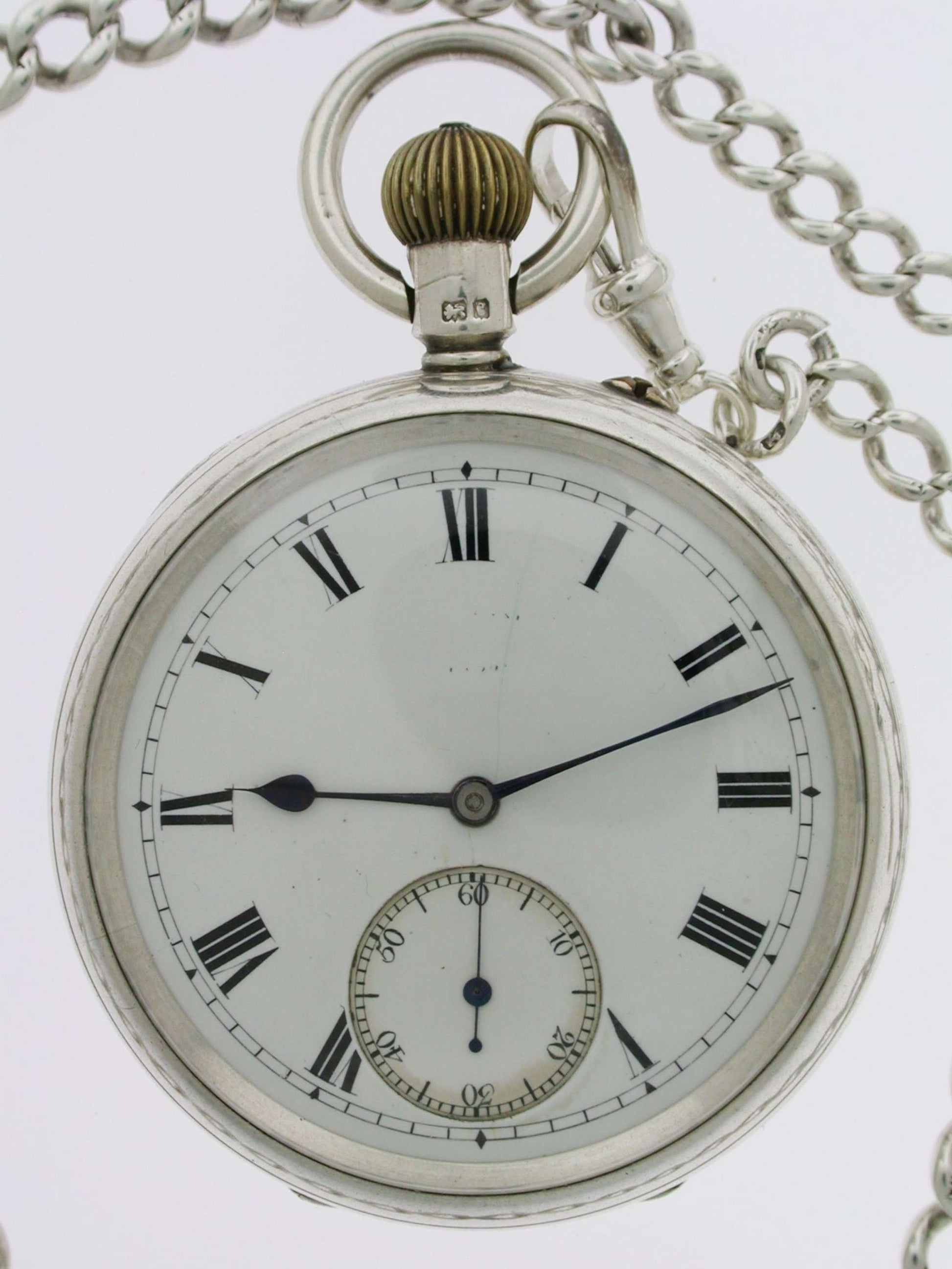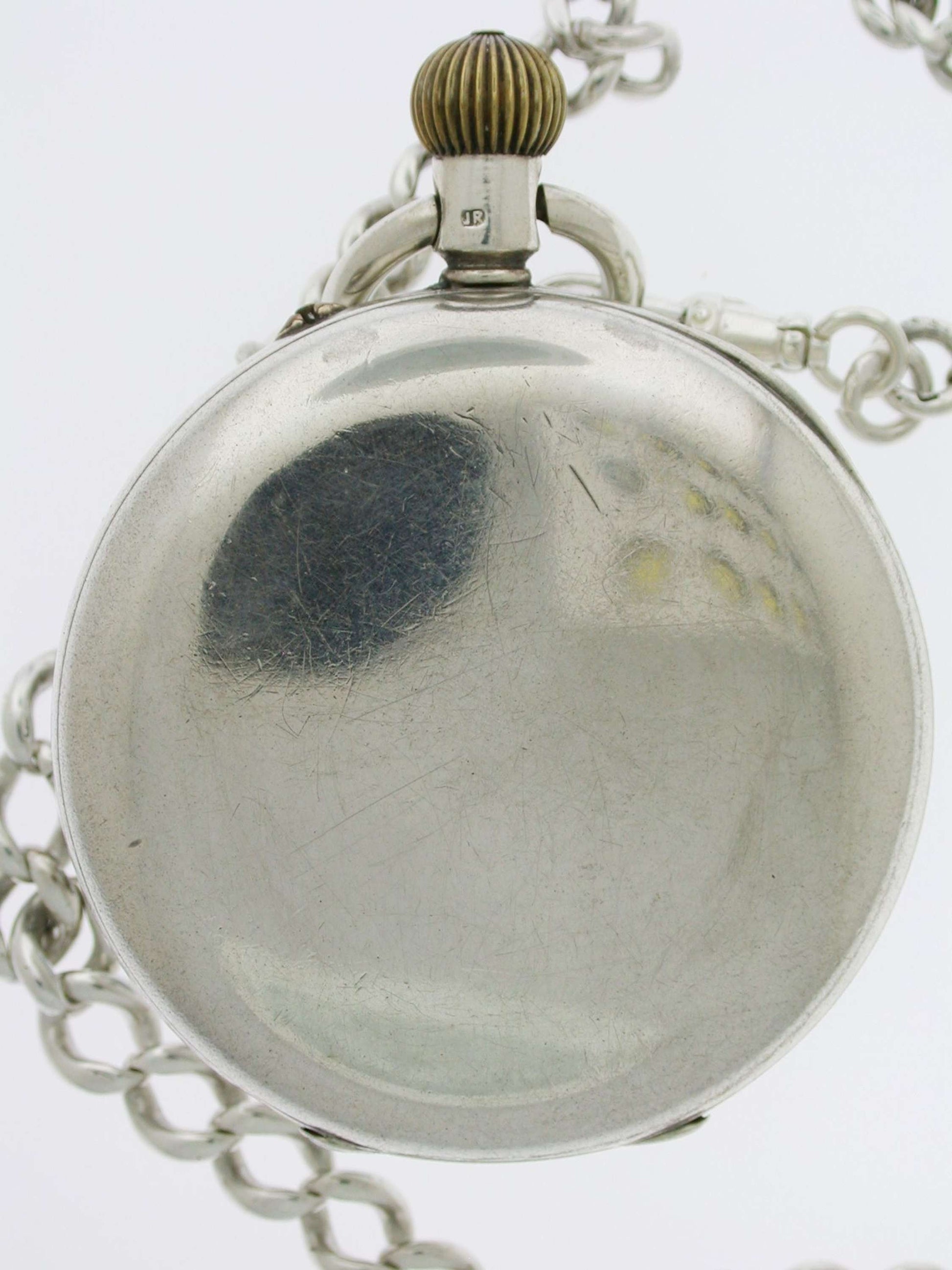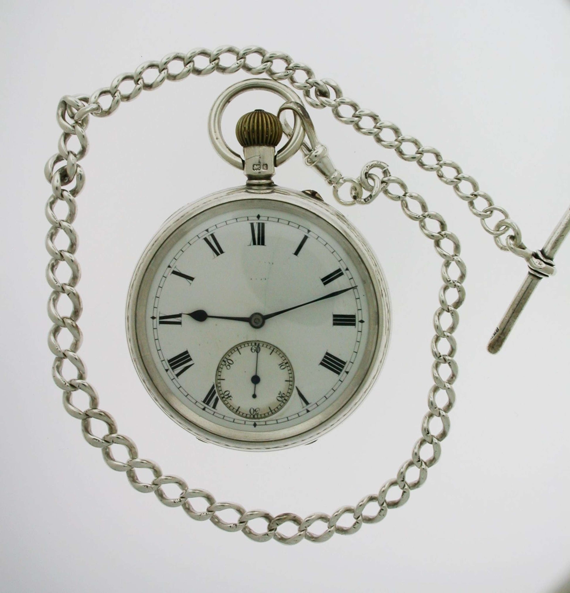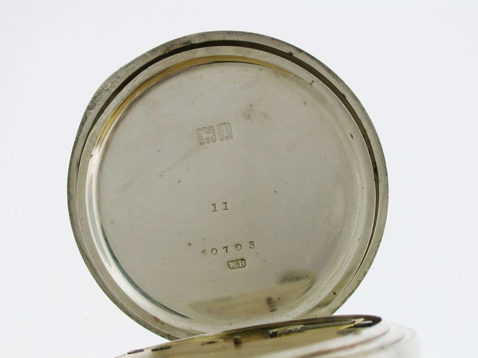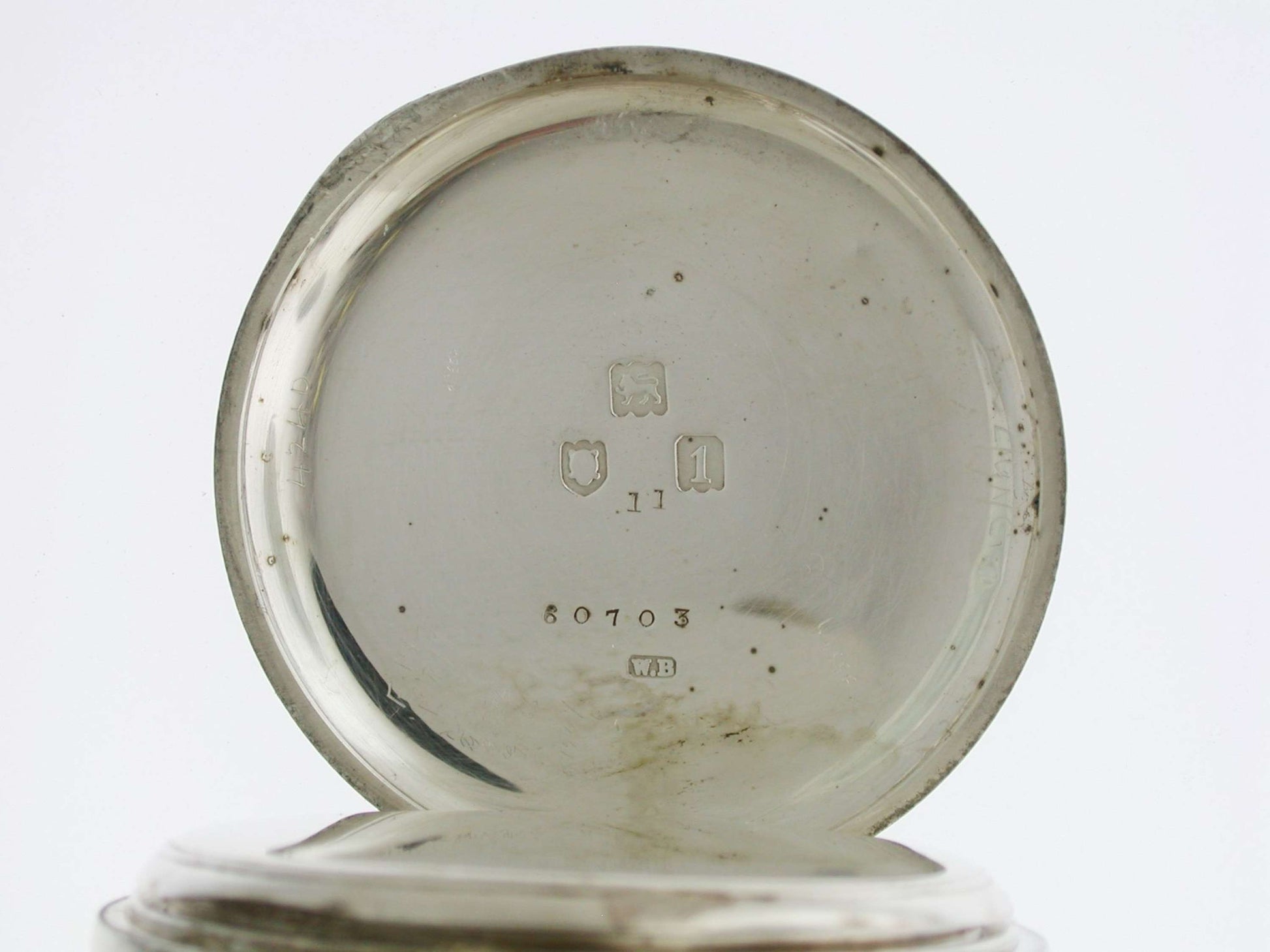 CASE: The pocket watch lies in a silver case with a smooth finish. The inner side of the case is hallmarked for silver London 1906 with the casemakers initials WB and numbered: 60703.