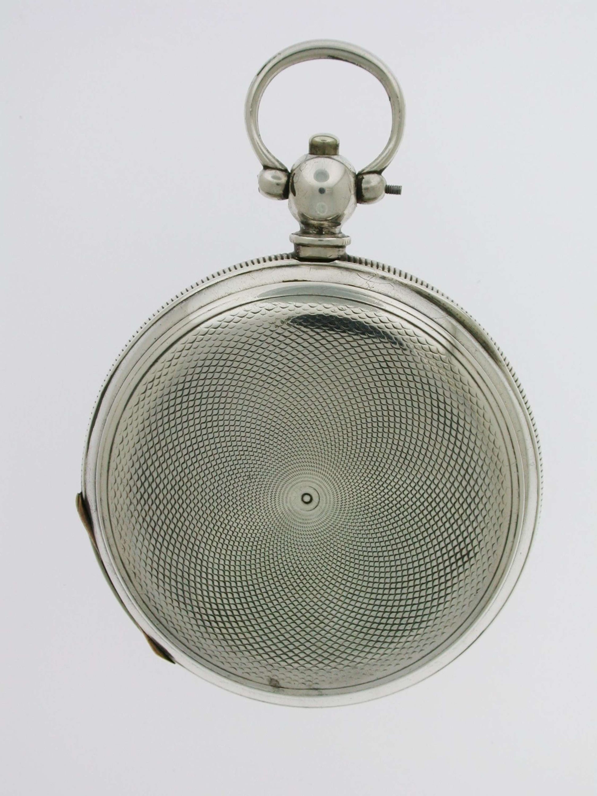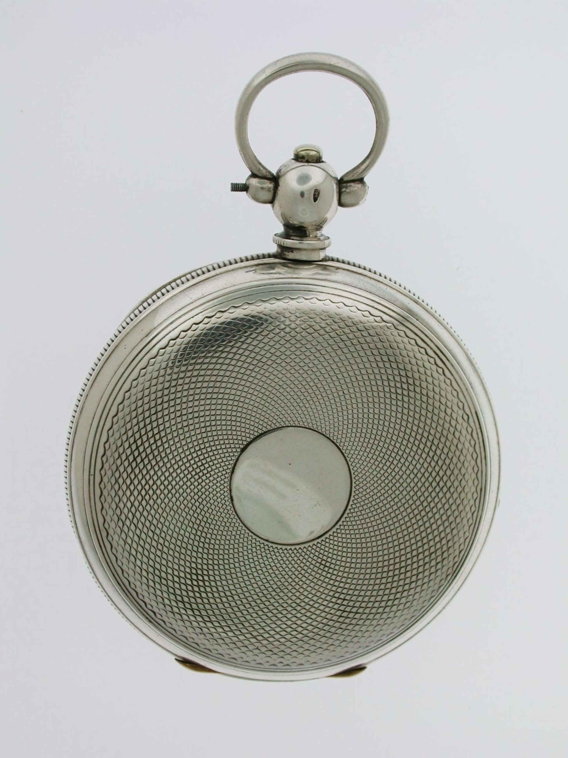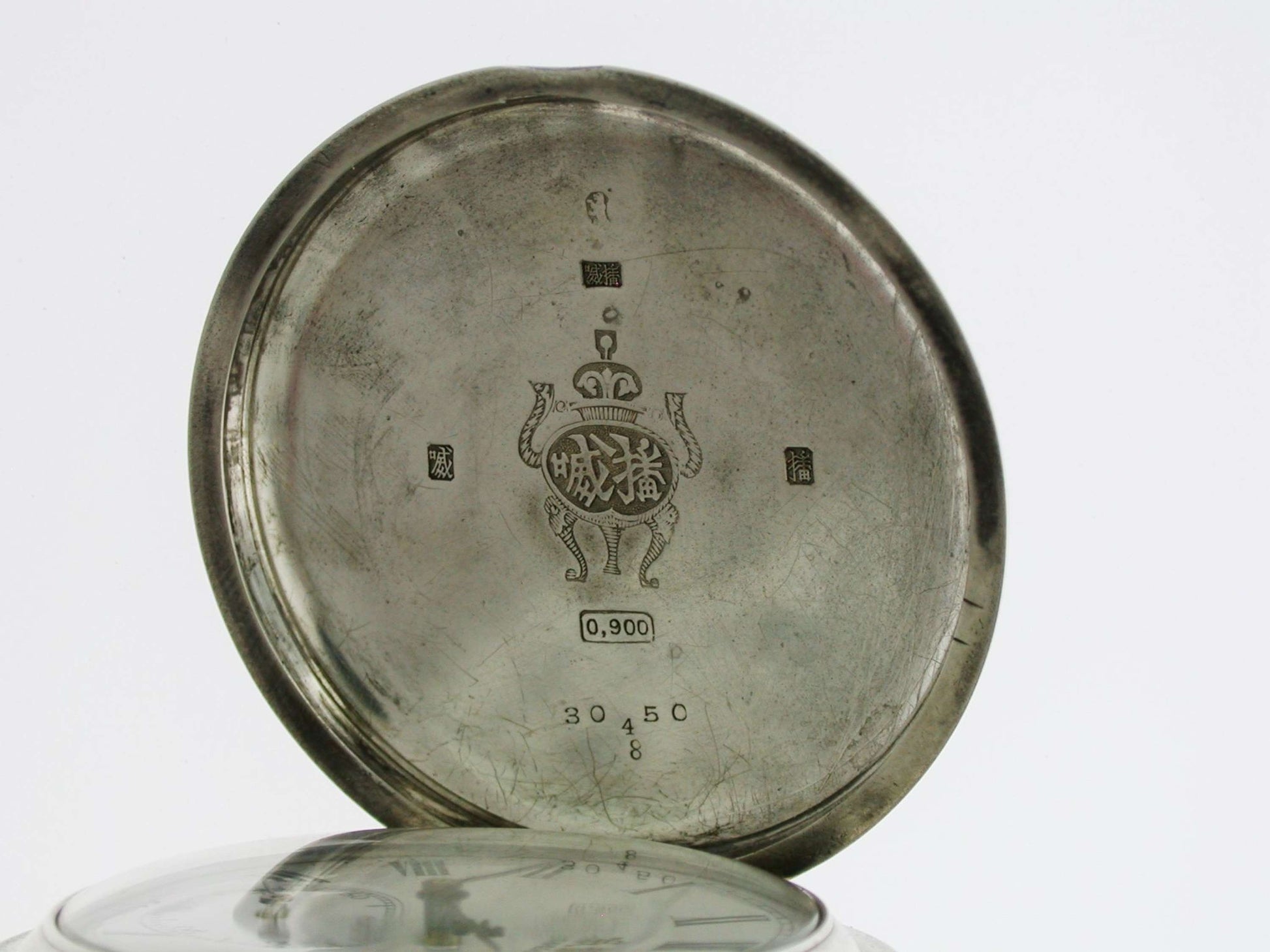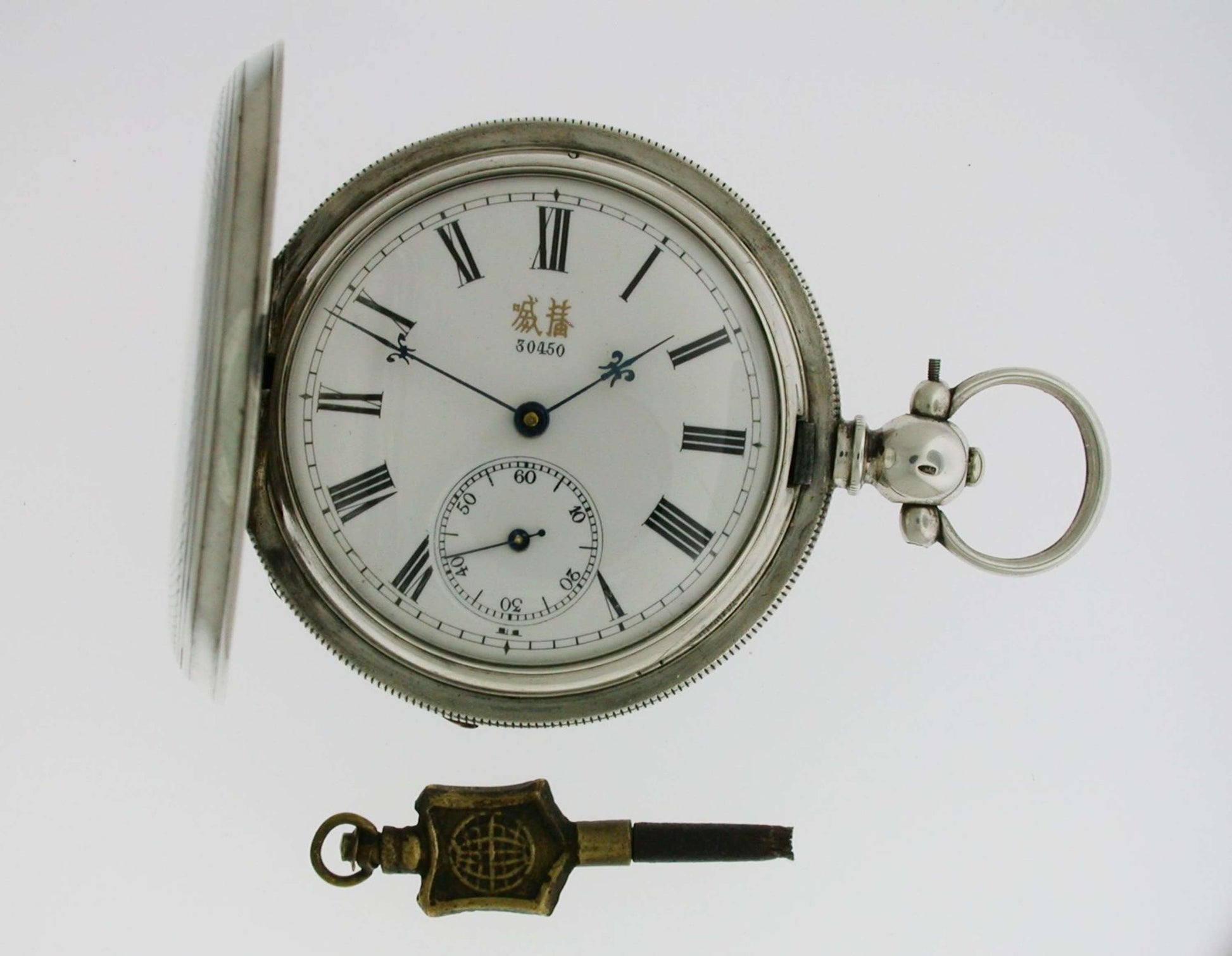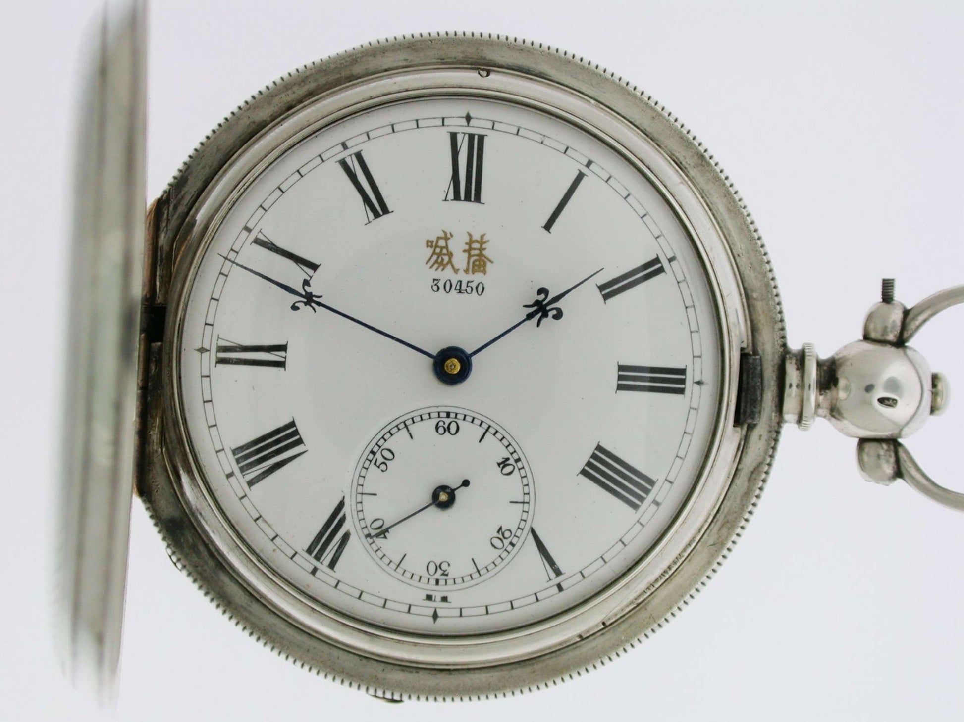 Case: The watch lies in a silver full hunter case with an engine turned finish on both sides and a monogram free cartouche. The inner side of the case is stamped for silver 0.900 and numbered: 30450 as well at Chinese hallmarks.