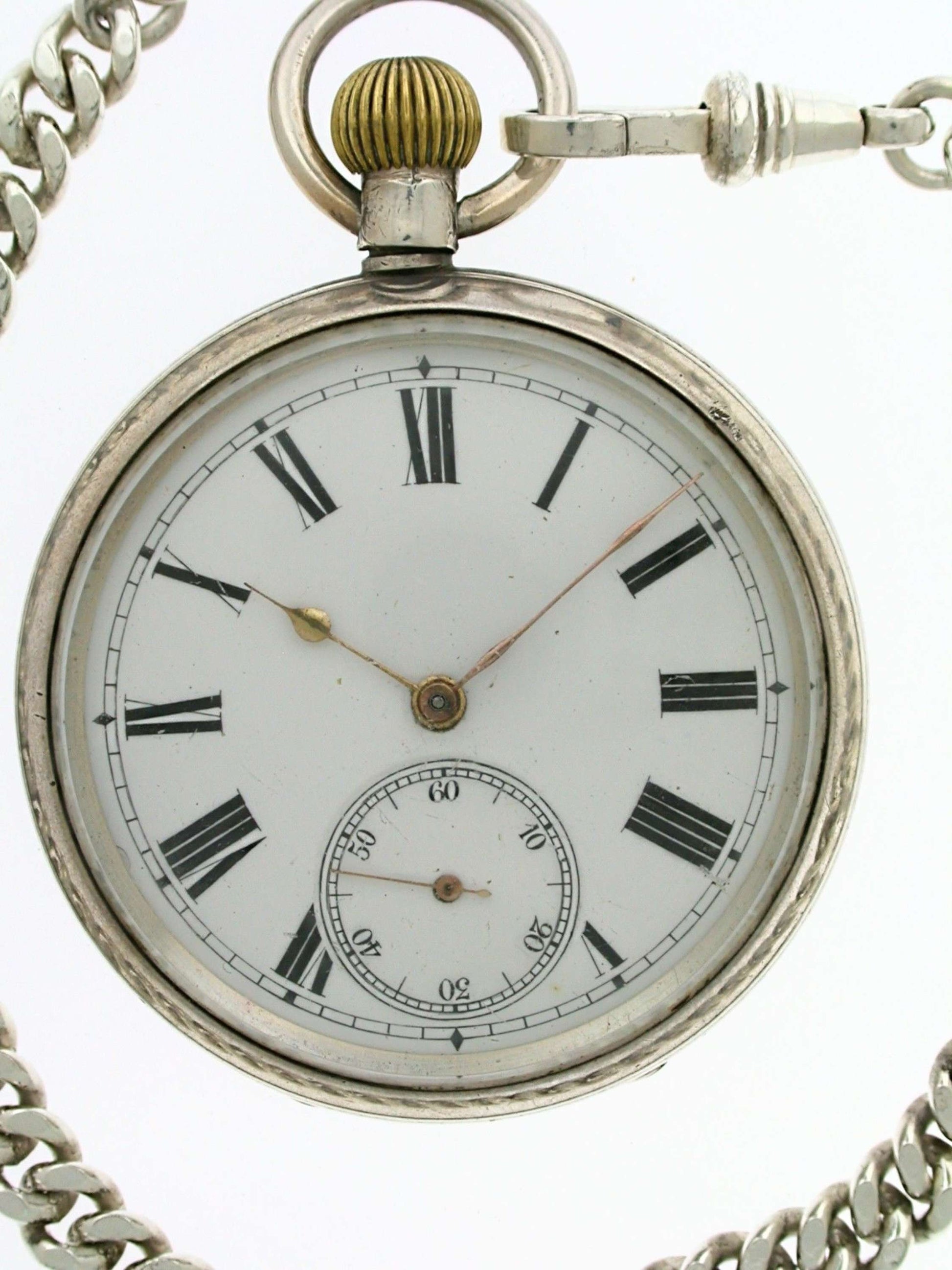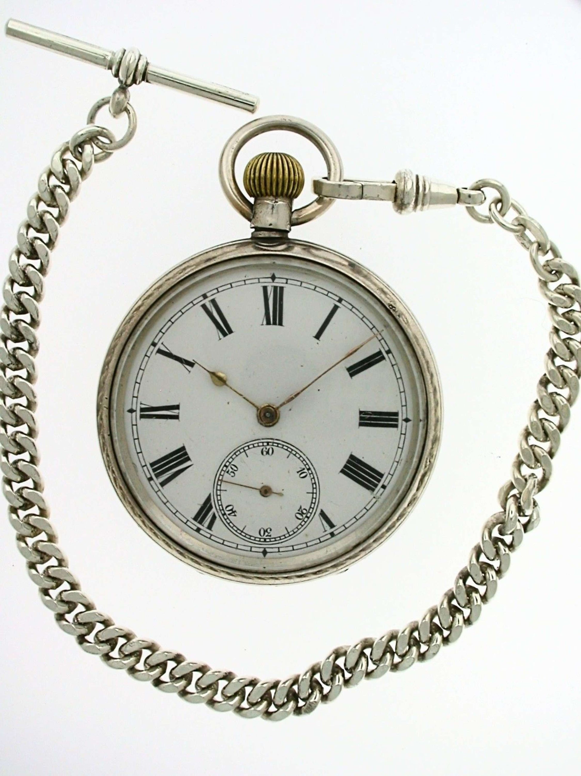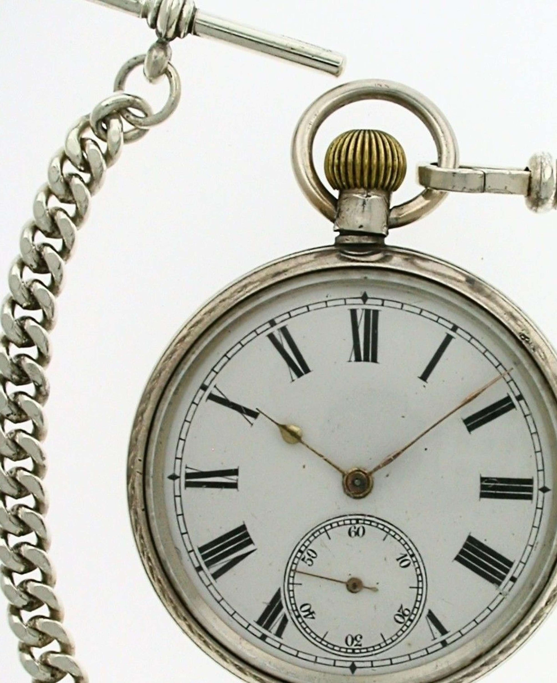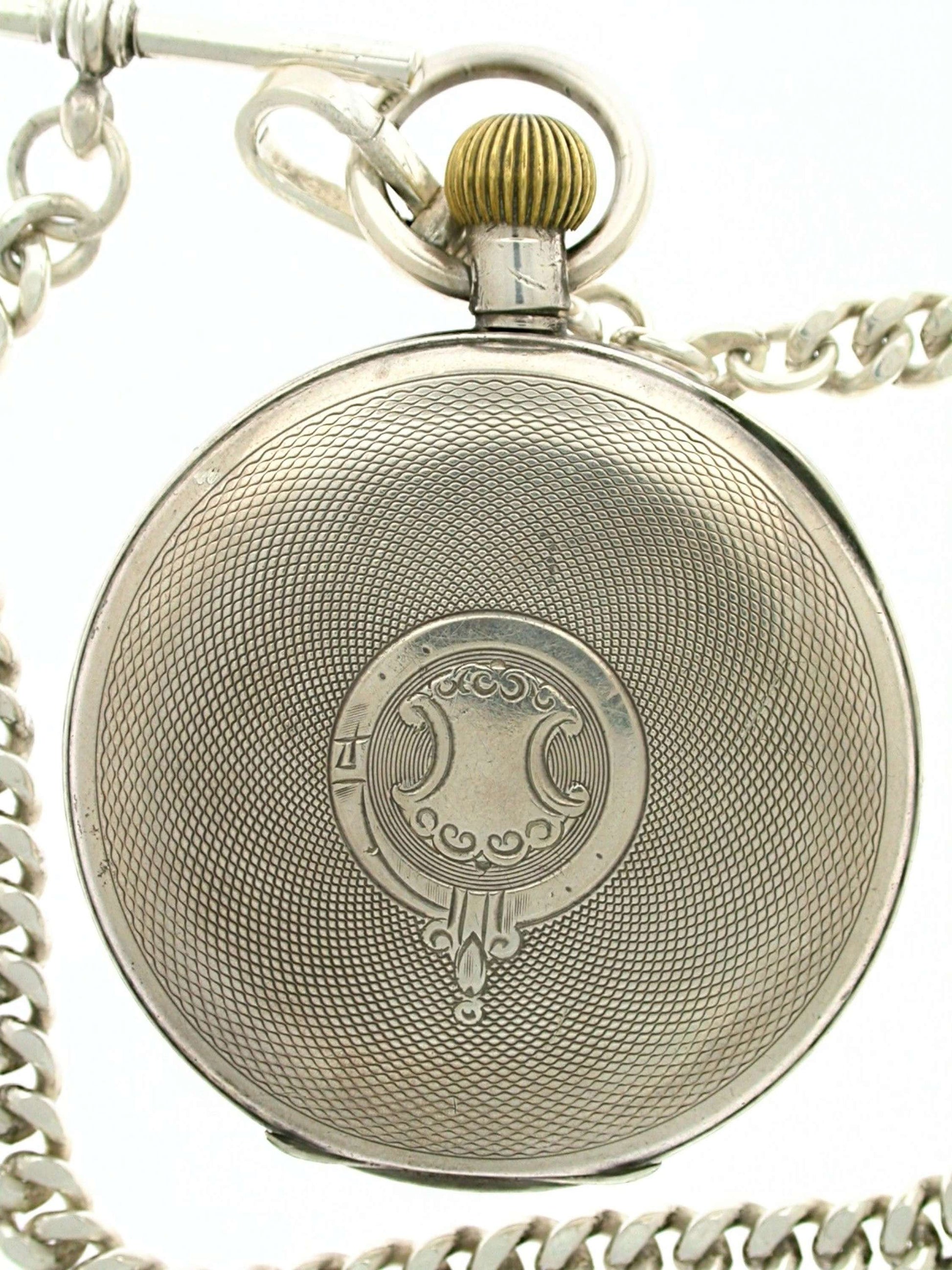 A Moeris silver 925 open face pocket watch, made in Switzerland and hallmarked for silver London 1928. The pocket watch is complete with chain.