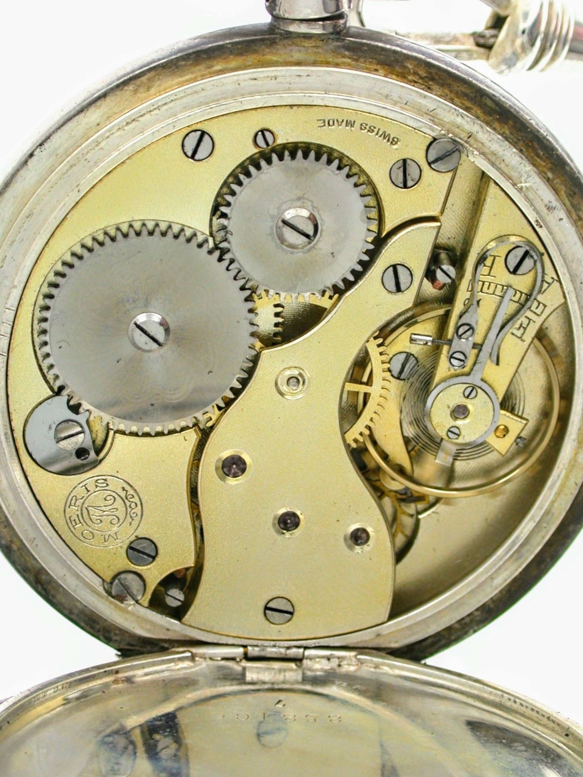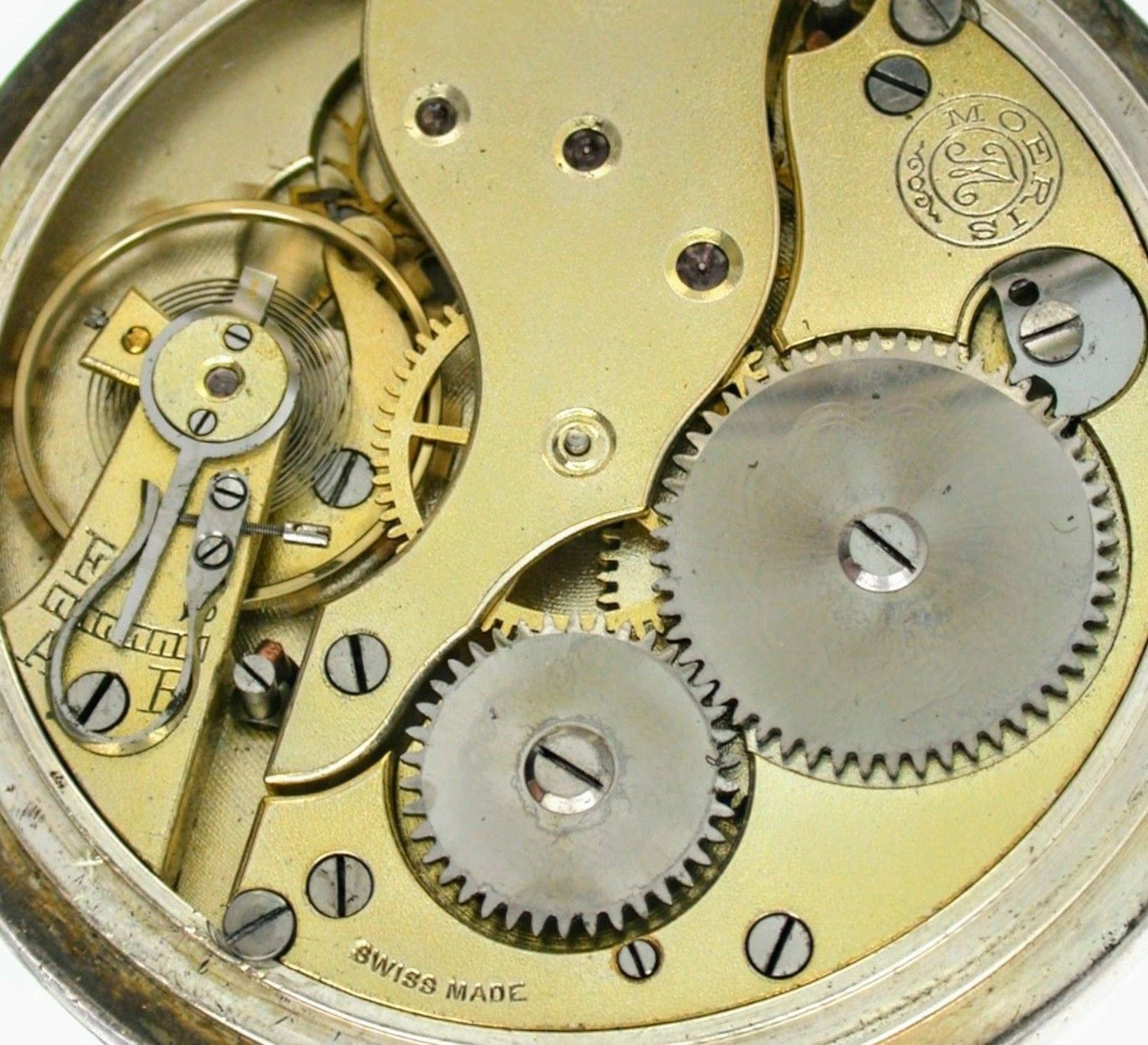 MOVEMENT: The anchor lever movement is in great working condition; however, we cannot guarantee accuracy for an antique pocket watch. The movement is decoratively signed: Moeris and Swiss Made.