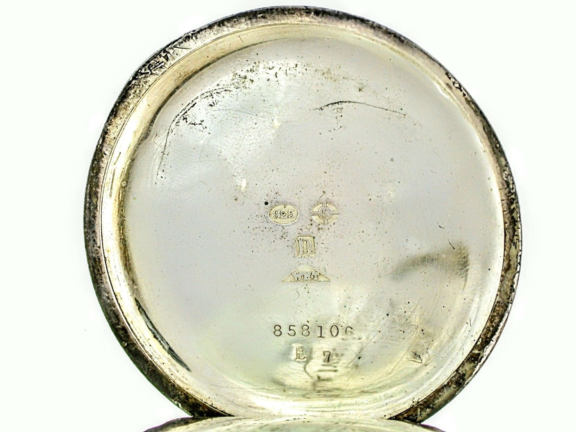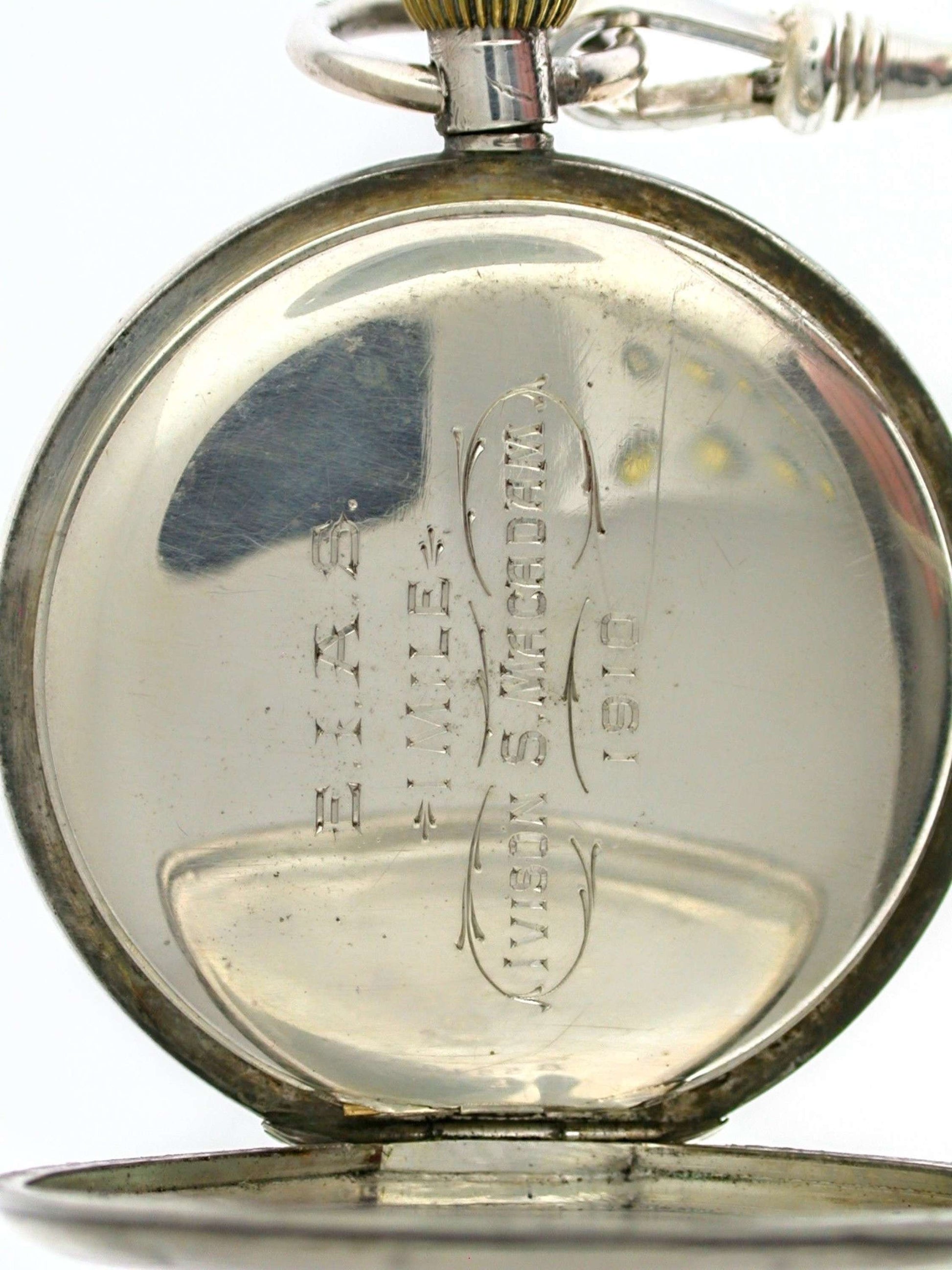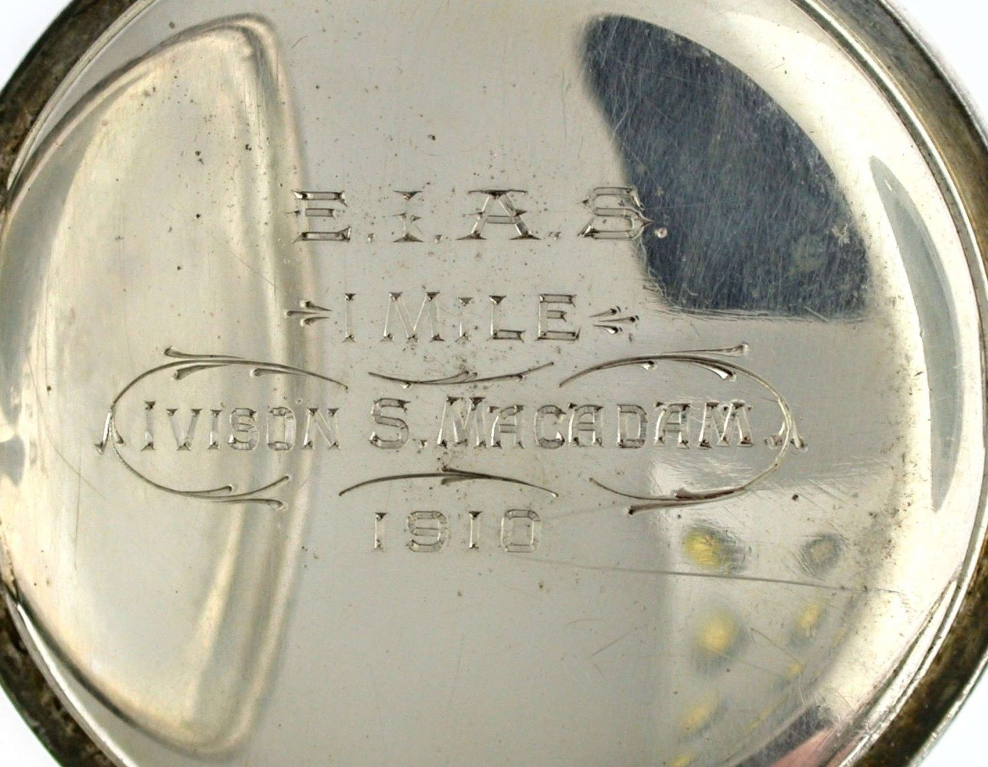 CASE: The watch lies in a silver case with an engine turned finish with a monogram free cartouche. The inner side of the case is hallmarked for Silver London 1928 and numbered: 858106. The cuvette is decoratively signed: “E.I.A.S., 1 Mile, Ivison S. Macadam, 1910”.