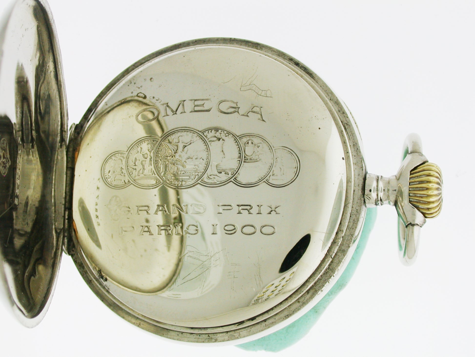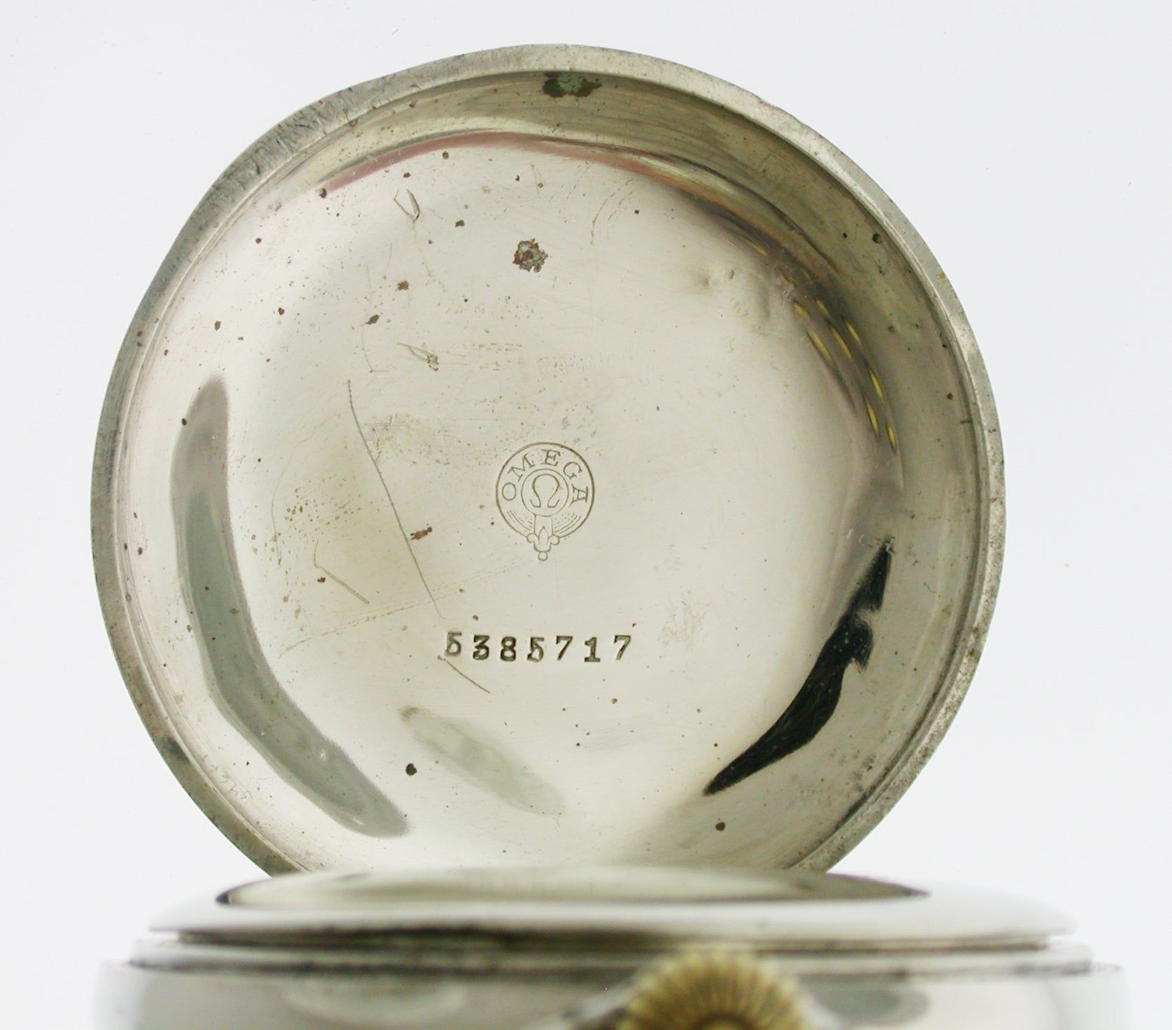 Case: This Omega pocket watch lies in an open-face steel case, it is monogram-free, engine-turned finish. Both the inner side of the case and the cuvette are numbered 5385717. The inner case bears the signature: "OMEGA". Meanwhile, the outer side of the cuvette is ornately decorated with various medals and includes the inscription: "OMEGA, Grand Prix Paris 1900".