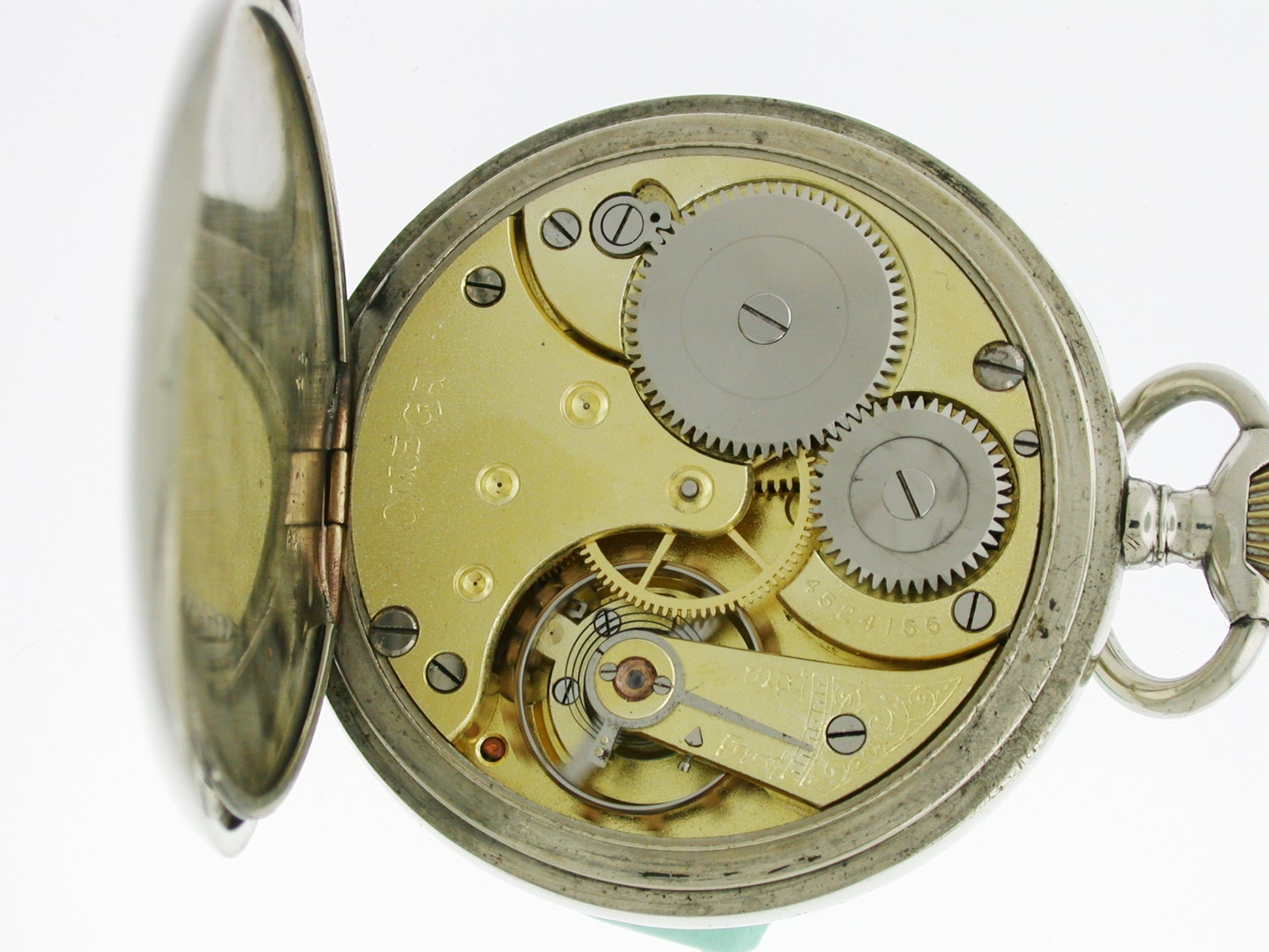 Dial: The white enamel dial has very clear black Arabic numerals with outer minute divisions. The dial has golden Stag beetle hands and a subsidiary seconds dial at the six. This original OMEGA pocket watch is signed OMEGA in the upper centre of the dial with its logo. The protective glass is in great condition.