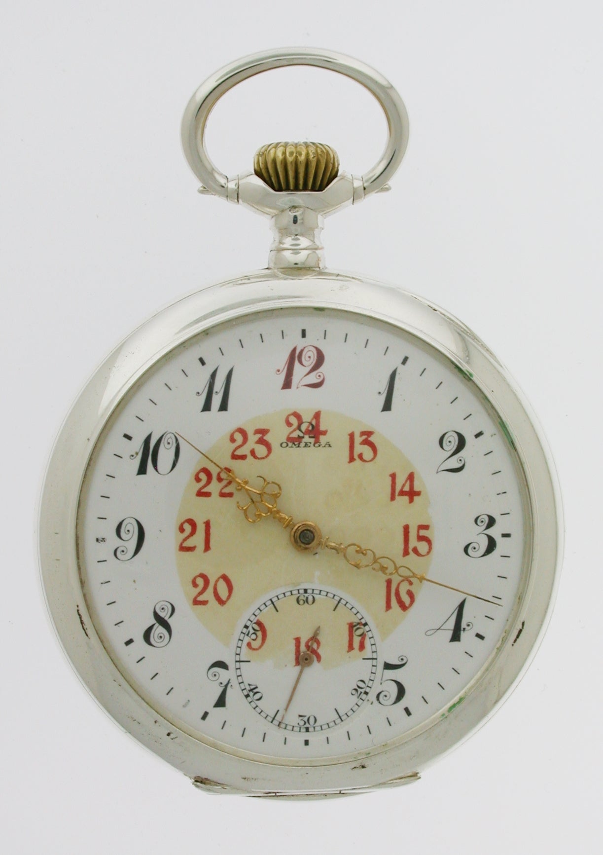 Dial: The white enamel dial has very clear black Arabic Art Nouveau numerals with outer minute divisions and inner 13–24-hour numbers. The dial has golden Art Nouveau hands and a subsidiary seconds dial at the six. This original OMEGA pocket watch is signed OMEGA in the upper centre of the dial with its logo. The protective glass is in great condition.