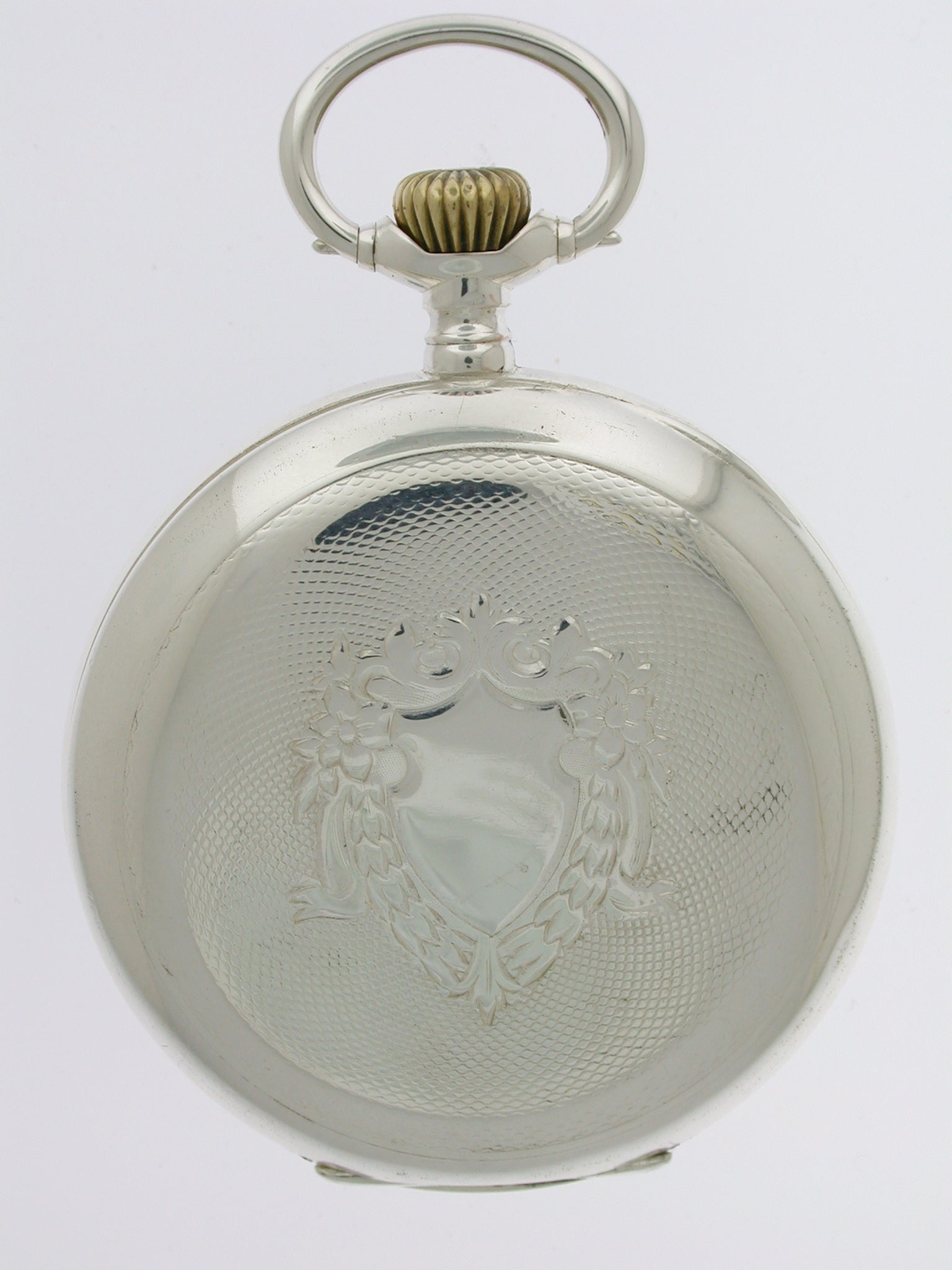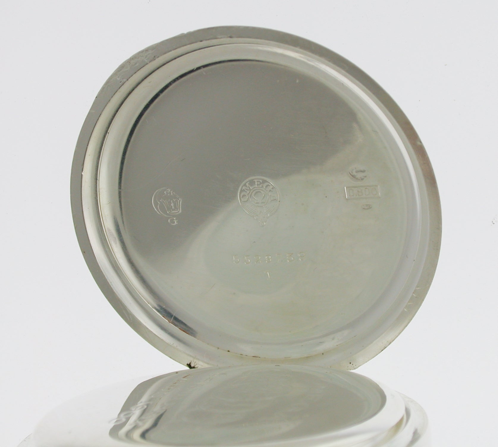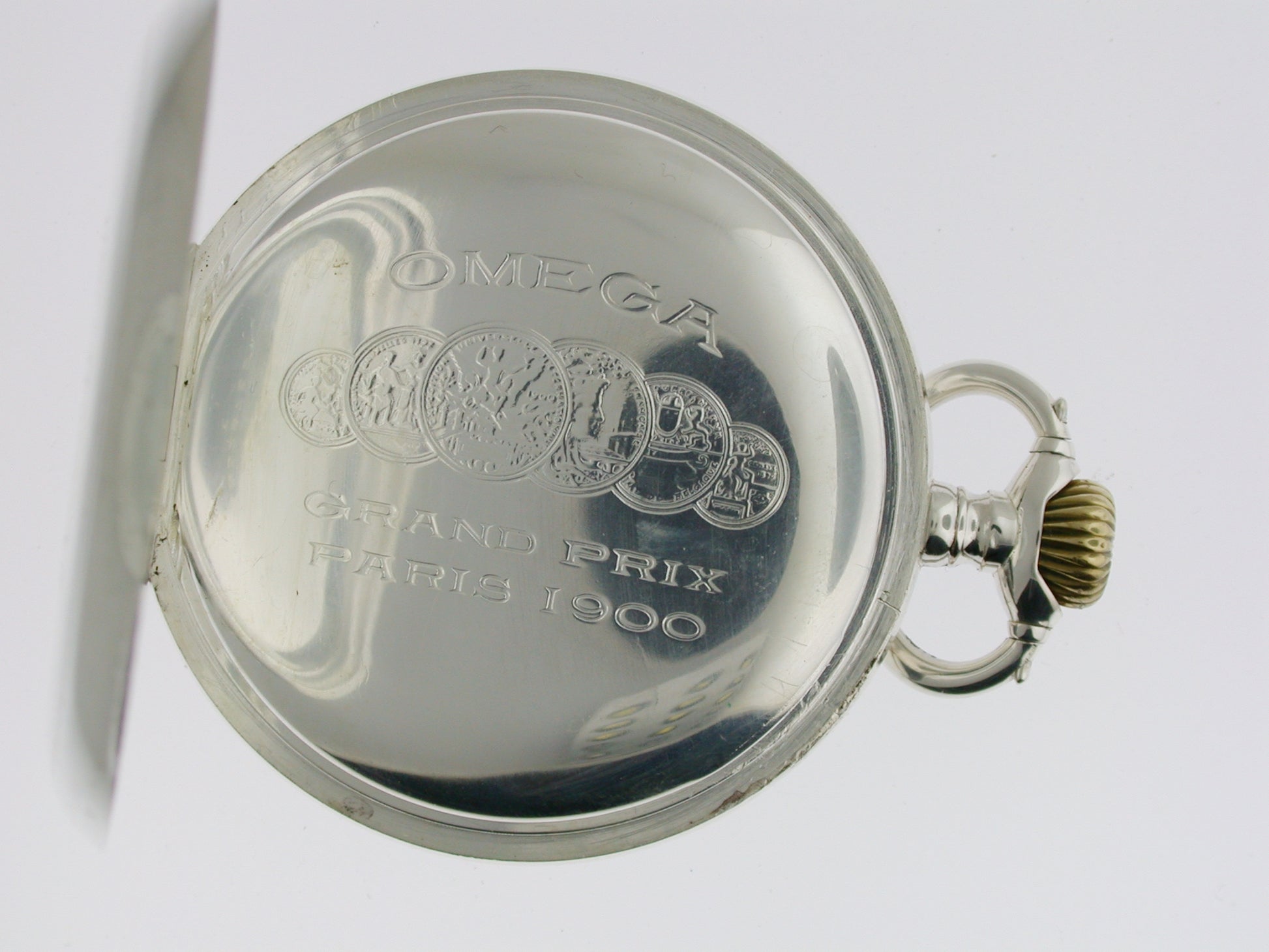 Case: This Omega pocket watch lies in a nice open face silver 0.800 case with a monogram free engine turned finish. The inner side of the case and the cuvette are numbered 5529739. The inner side of the case is signed: "OMEGA". The outer side of the cuvette shows different medals and is decoratively signed: "OMEGA, Grand Prix Paris 1900".