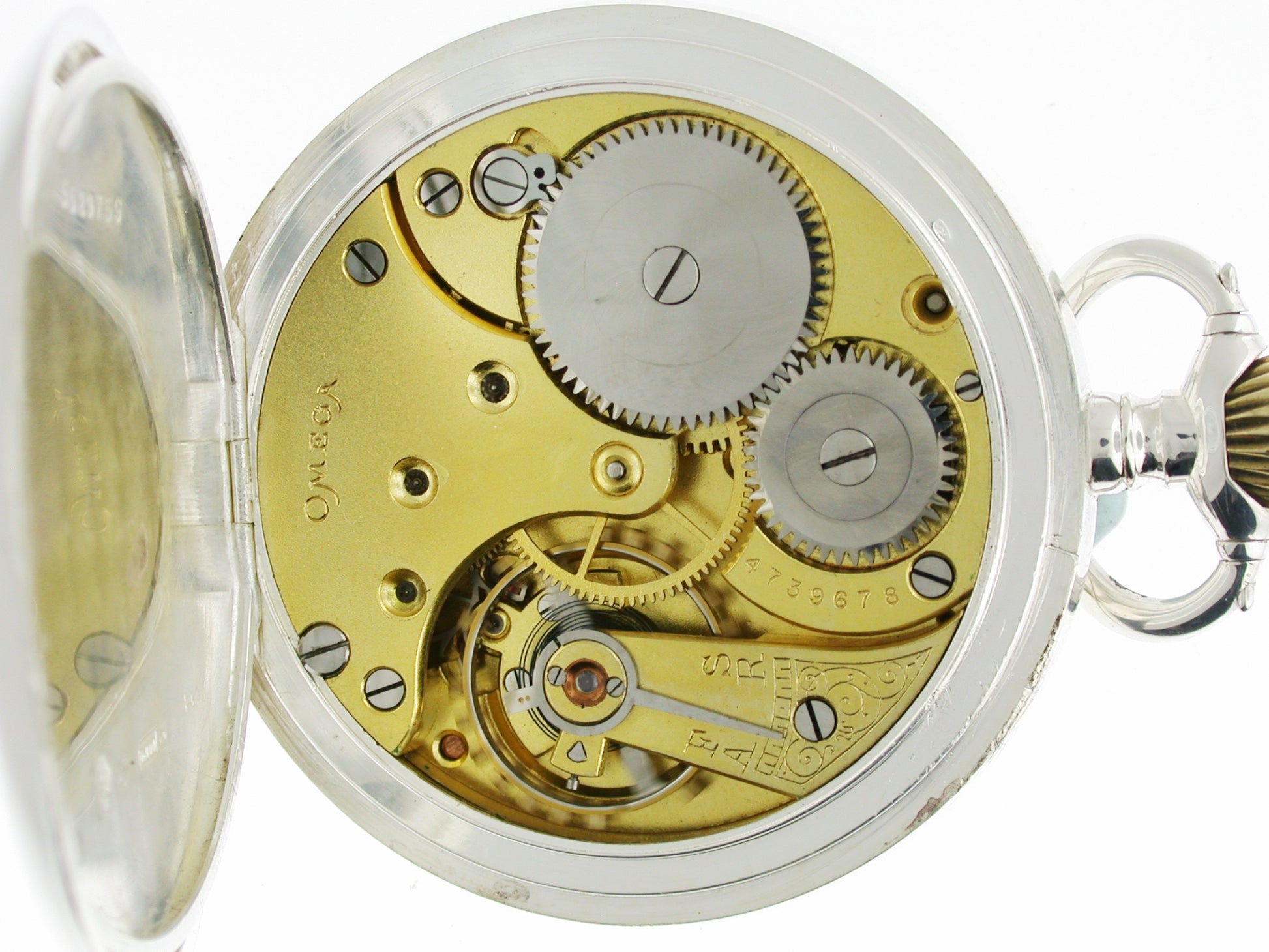 Movement: The high grade fifteen jewels anchor lever escapement movement has a plain cock with polished steel regulator and a club foot lever escapement with compensation balance wheel. The pocket watch is in excellent working condition, however, we cannot guarantee accuracy for an antique pocket watch. The movement is decoratively signed "OMEGA" and numbered: 4739678.