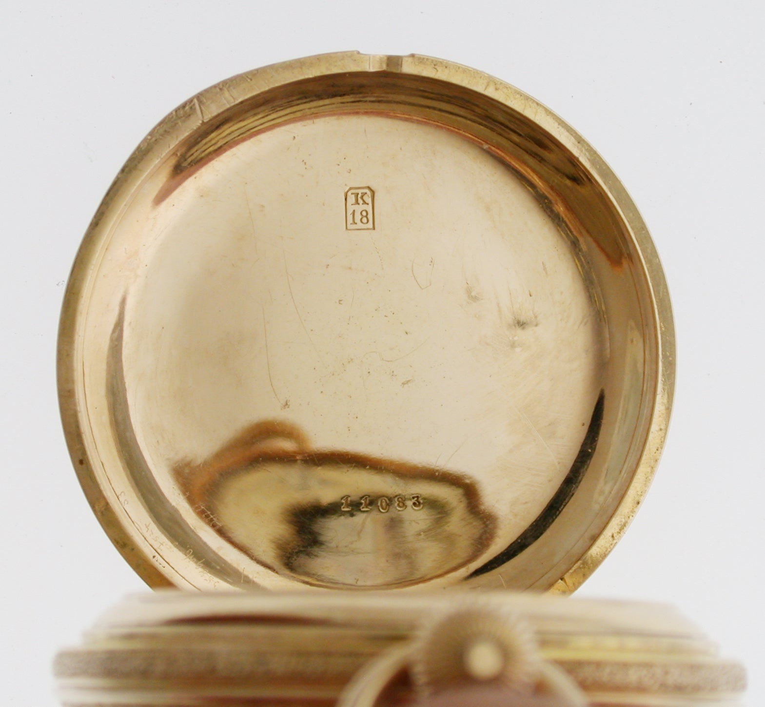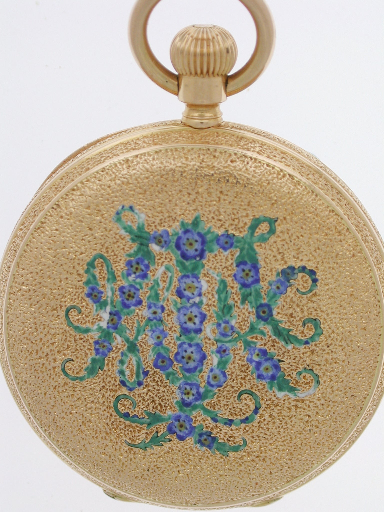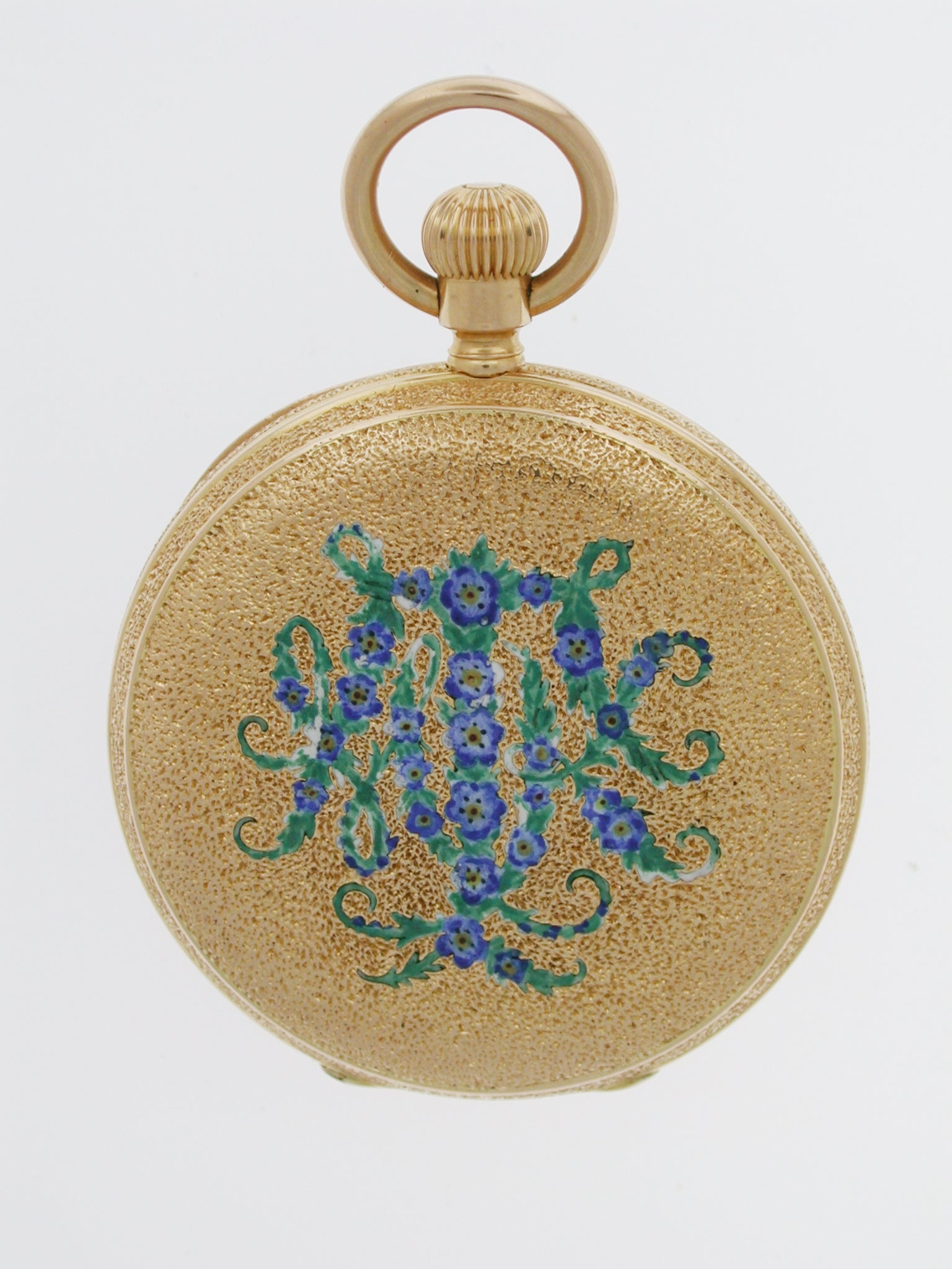 Case: The pocket watch lies in a full-hunter fully textured 18kt gold case with gold hinges. The rear of the pocket watch has a stunning blue floral monogram. The inner side of the case is hallmarked 18kt and numbered: 11083.