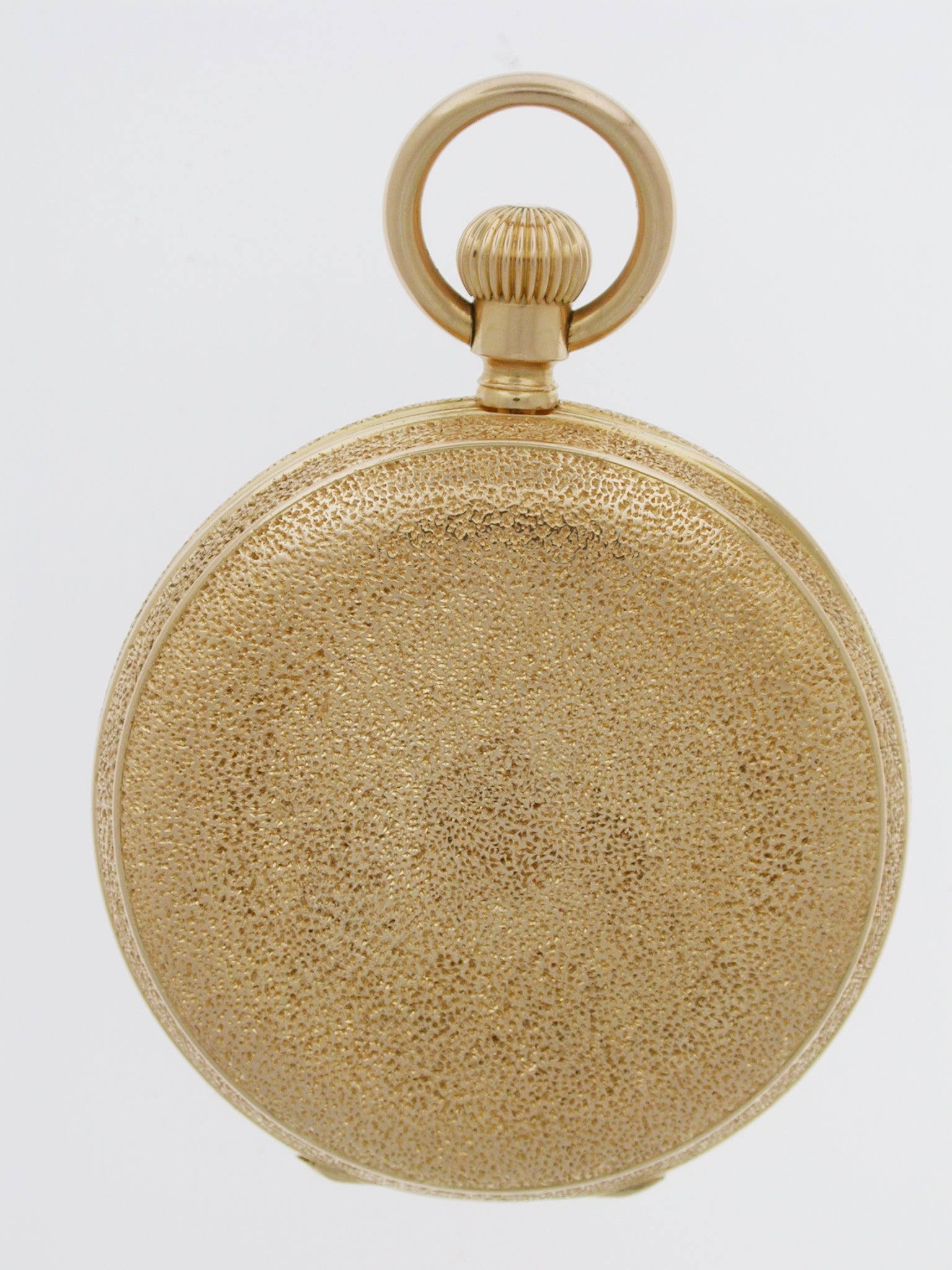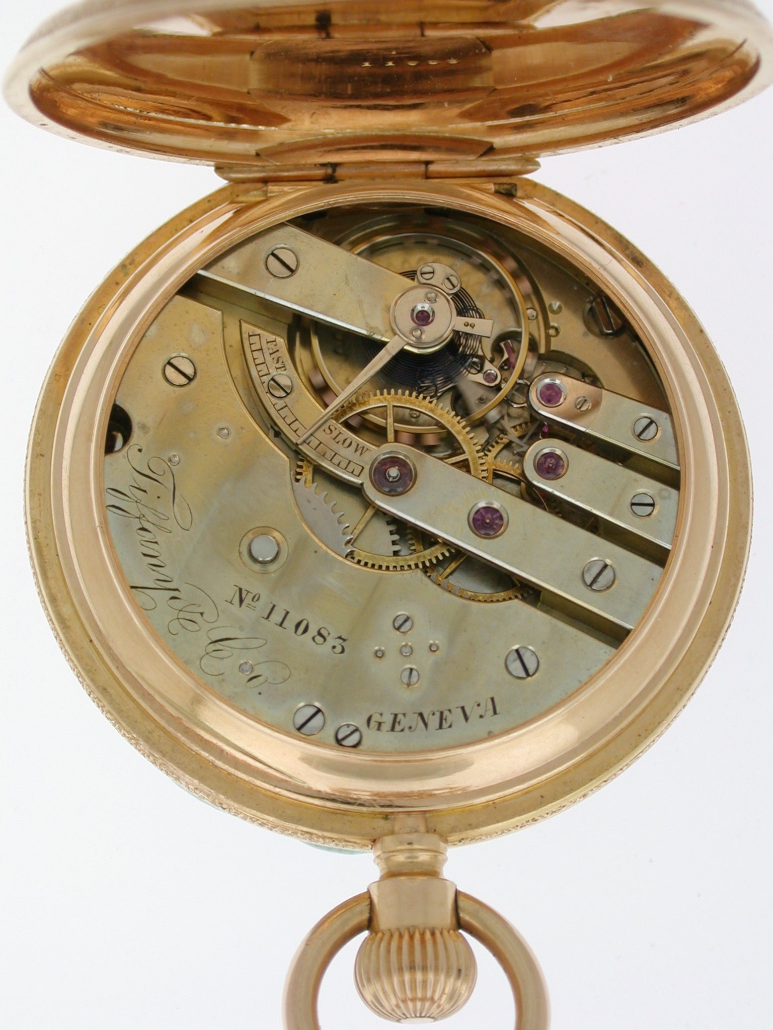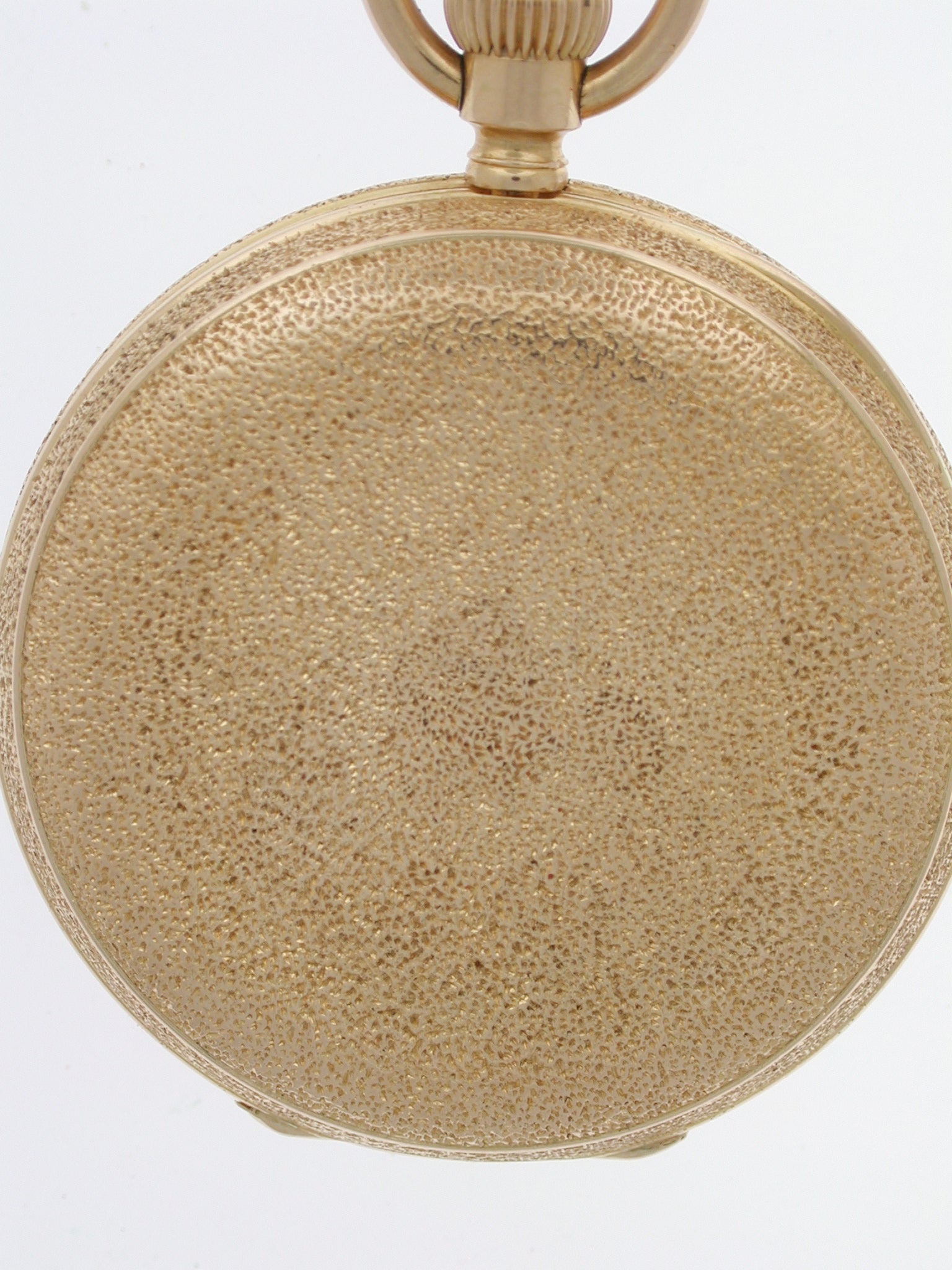Case: The pocket watch lies in a full-hunter fully textured 18kt gold case with gold hinges. The rear of the pocket watch has a stunning blue floral monogram. The inner side of the case is hallmarked 18kt and numbered: 11083.