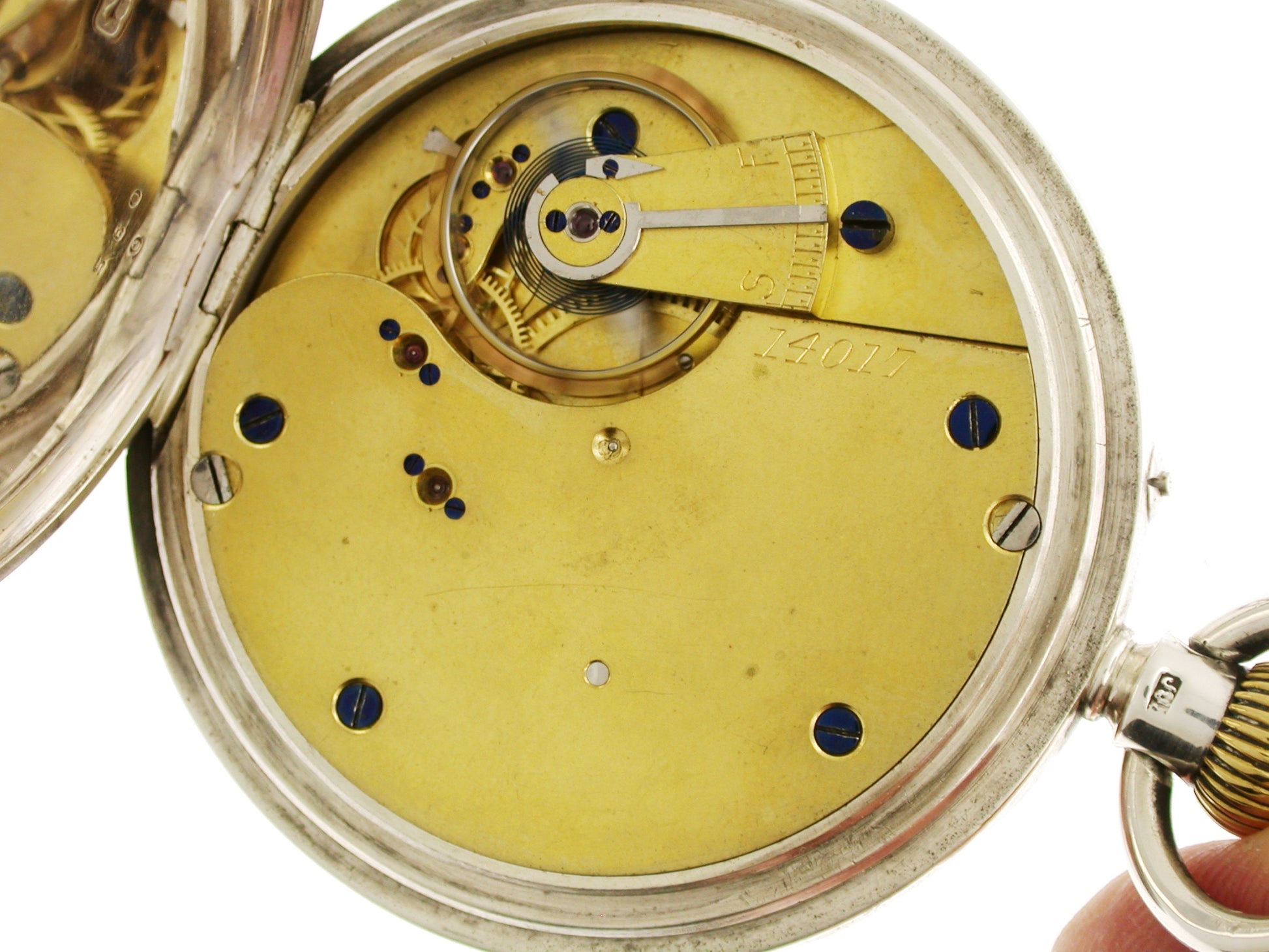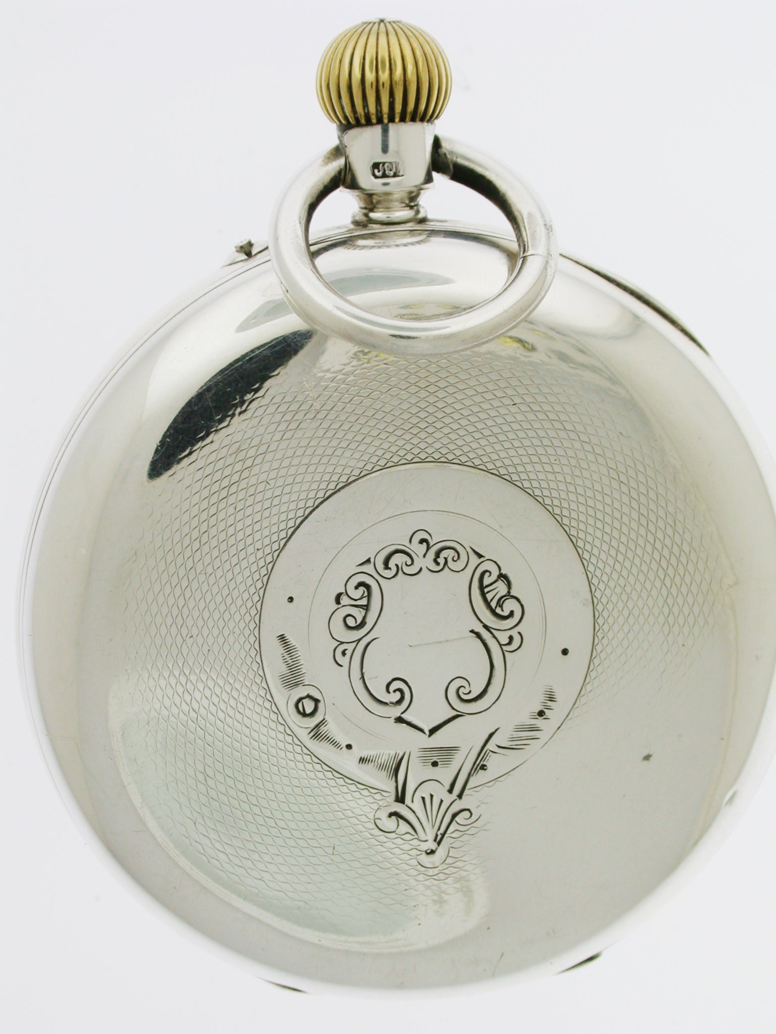 CASE: The watch lies in a silver open-face case with an engine-turned finish and a monogram-free cartouche. The inner side of the case is hallmarked silver/London 1899 and numbered 14017-560. The case maker is ‘JJS’