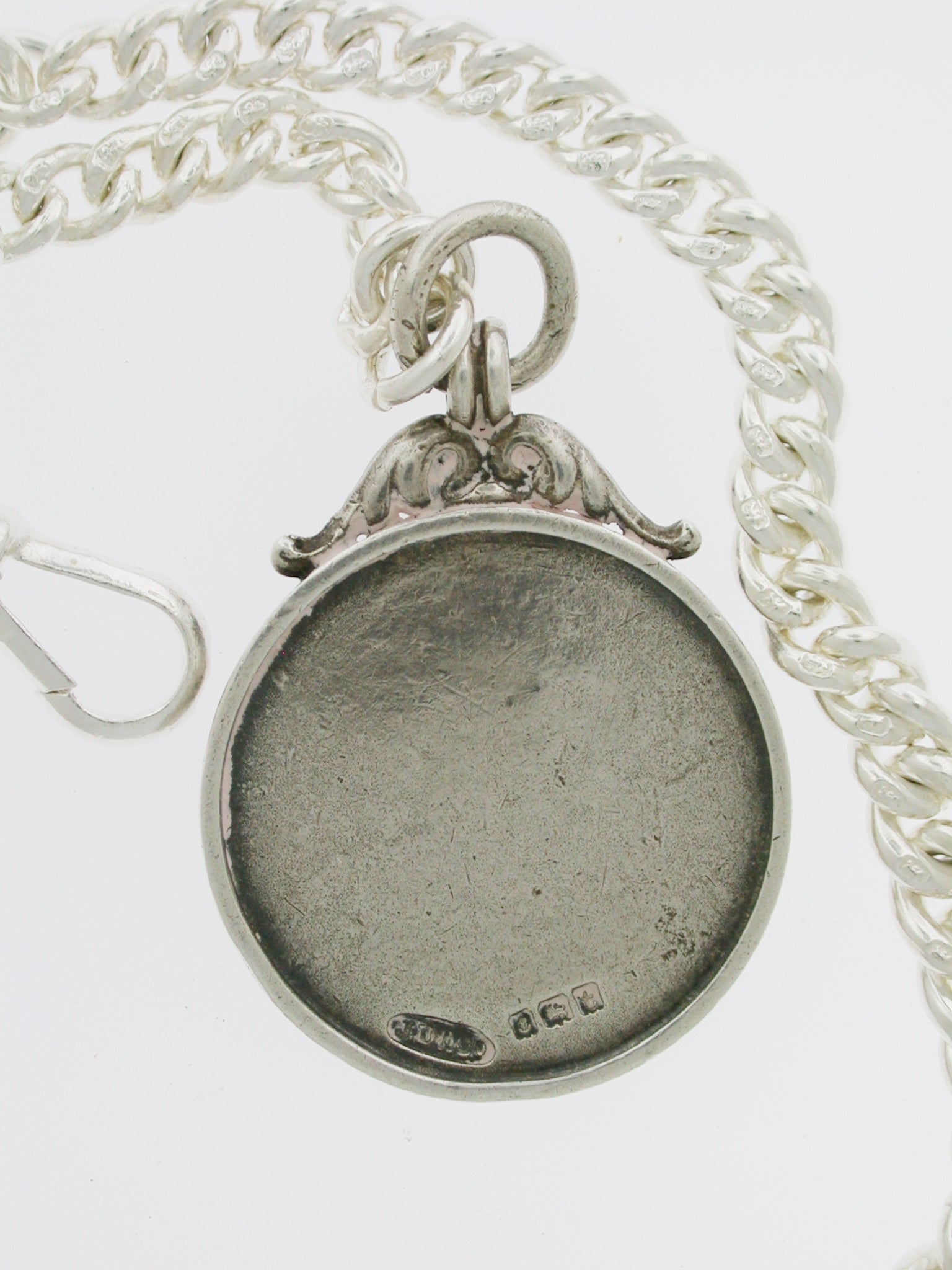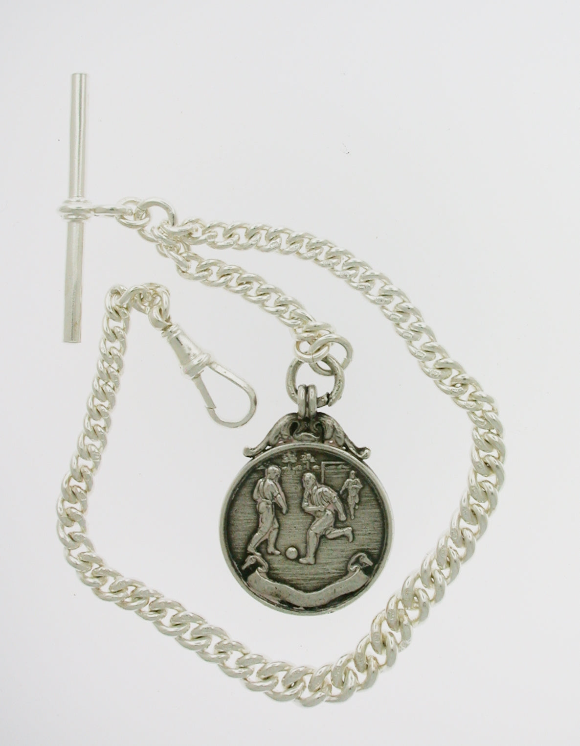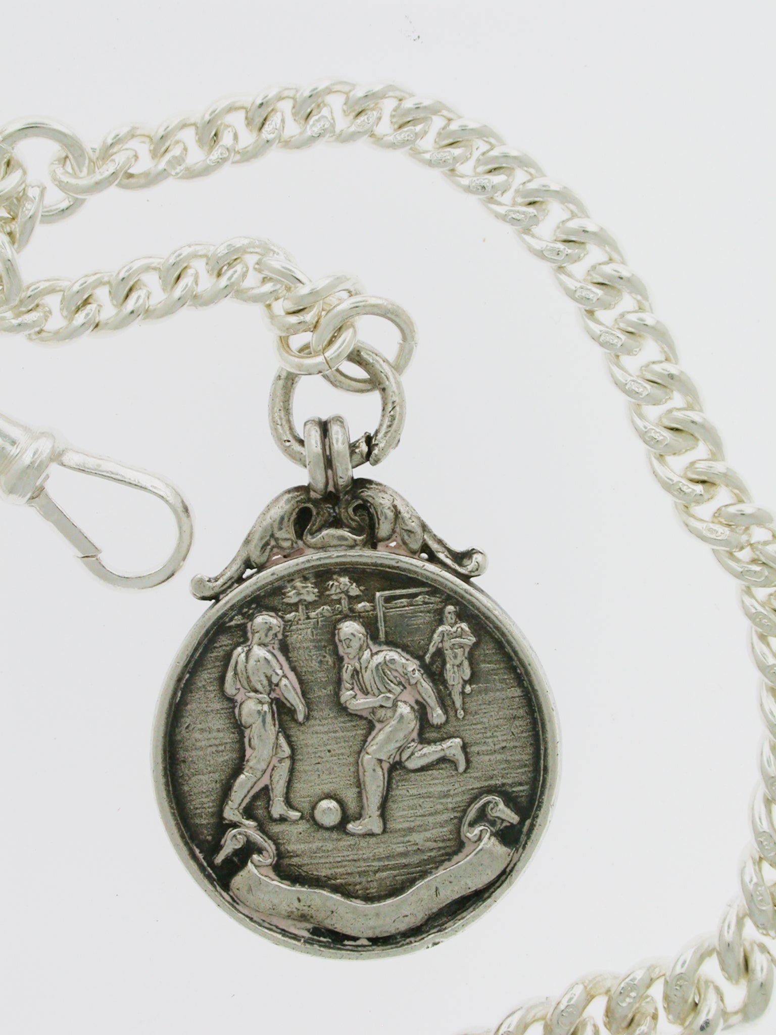 You are bidding on a silver chain, and each link is hallmarked with a lion, which has a silver fob with a football scene, which is hallmarked Birmingham 1918.