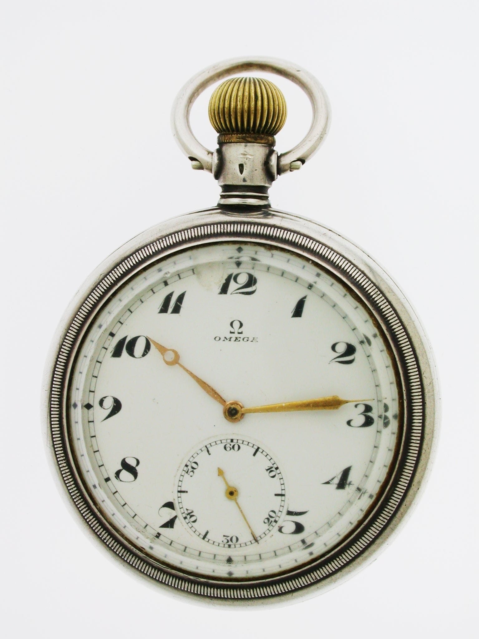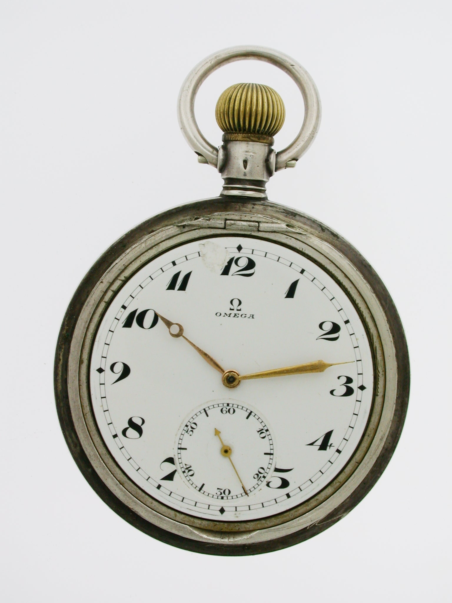 DIAL: The white enamel dial has black Arabic numerals with outer minute divisions and with gold hands. It has a subsidiary second’s dial at the six. The dial is signed Omega. It has a crack between the 11 and 12.