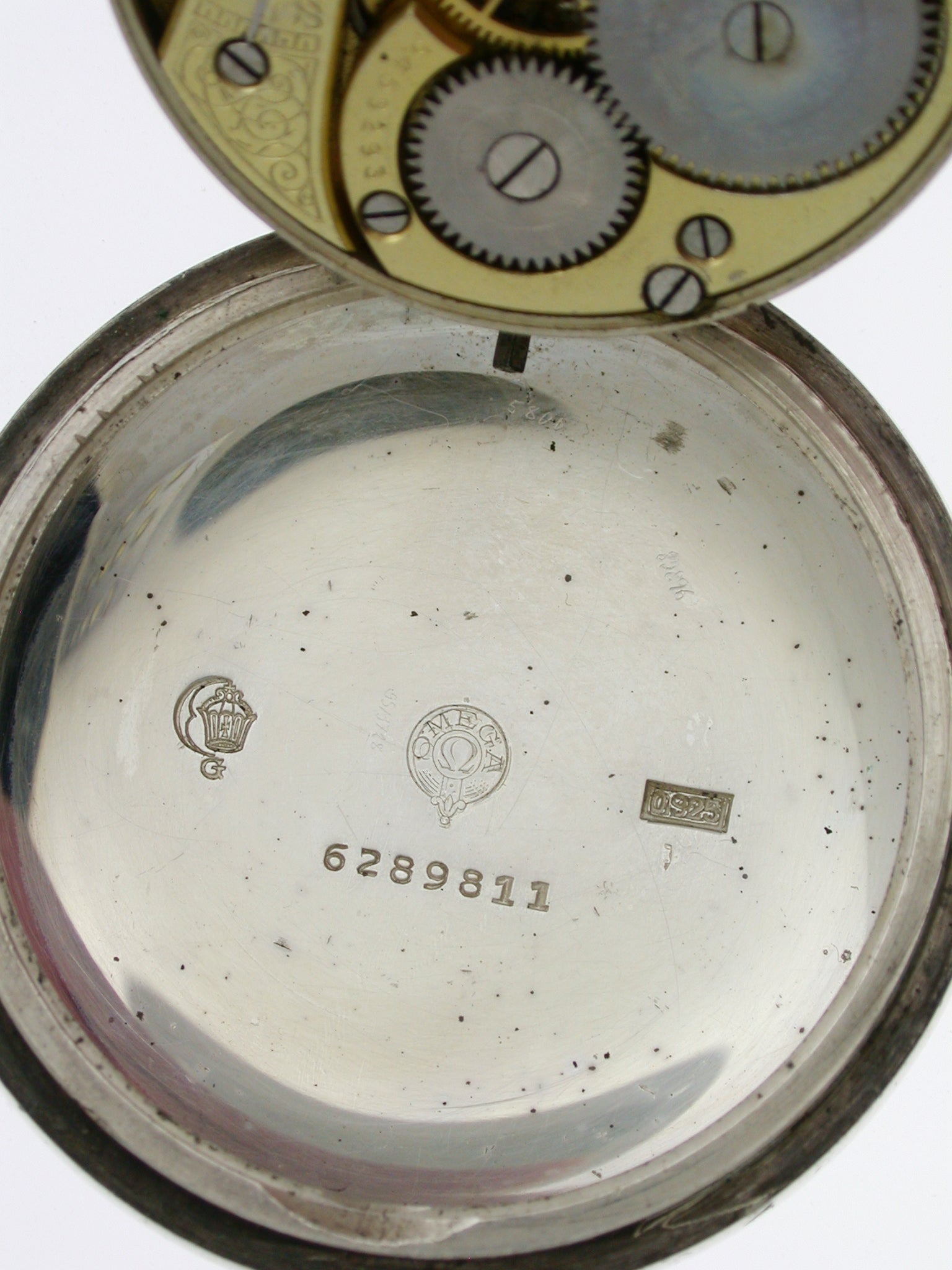 CASE: The watch lies in a silver open-face screw-back front case covered with the original bevelled glass, the glass has a few scratches. The inner case is numbered ‘6289811’. It has a locomotive scene on the rear in 14kt rose gold.