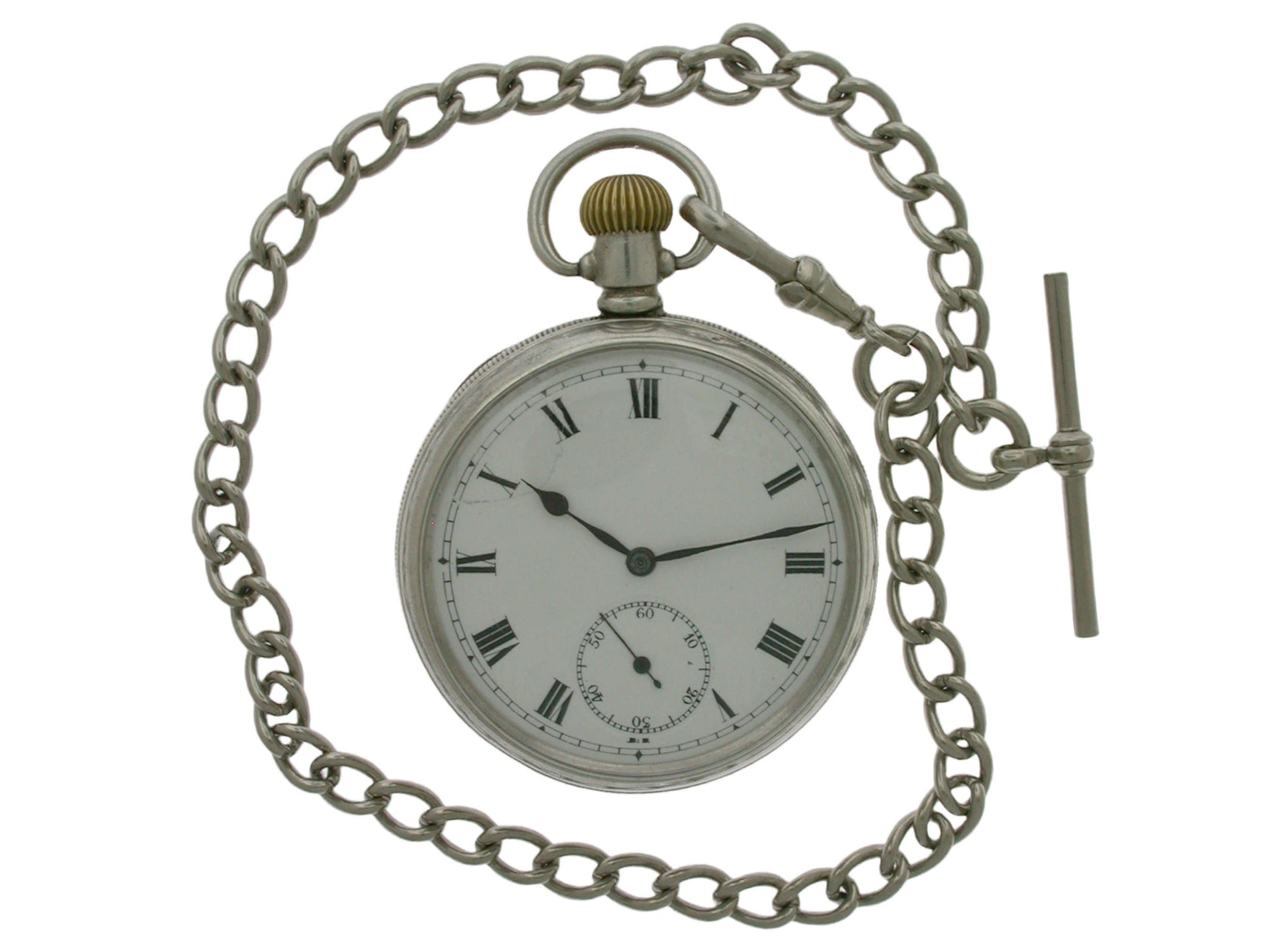 A silver open face men’s pocket watch, hallmarked for Silver Birmingham 1912. The pocket watch is complete with a silver-coloured chain.