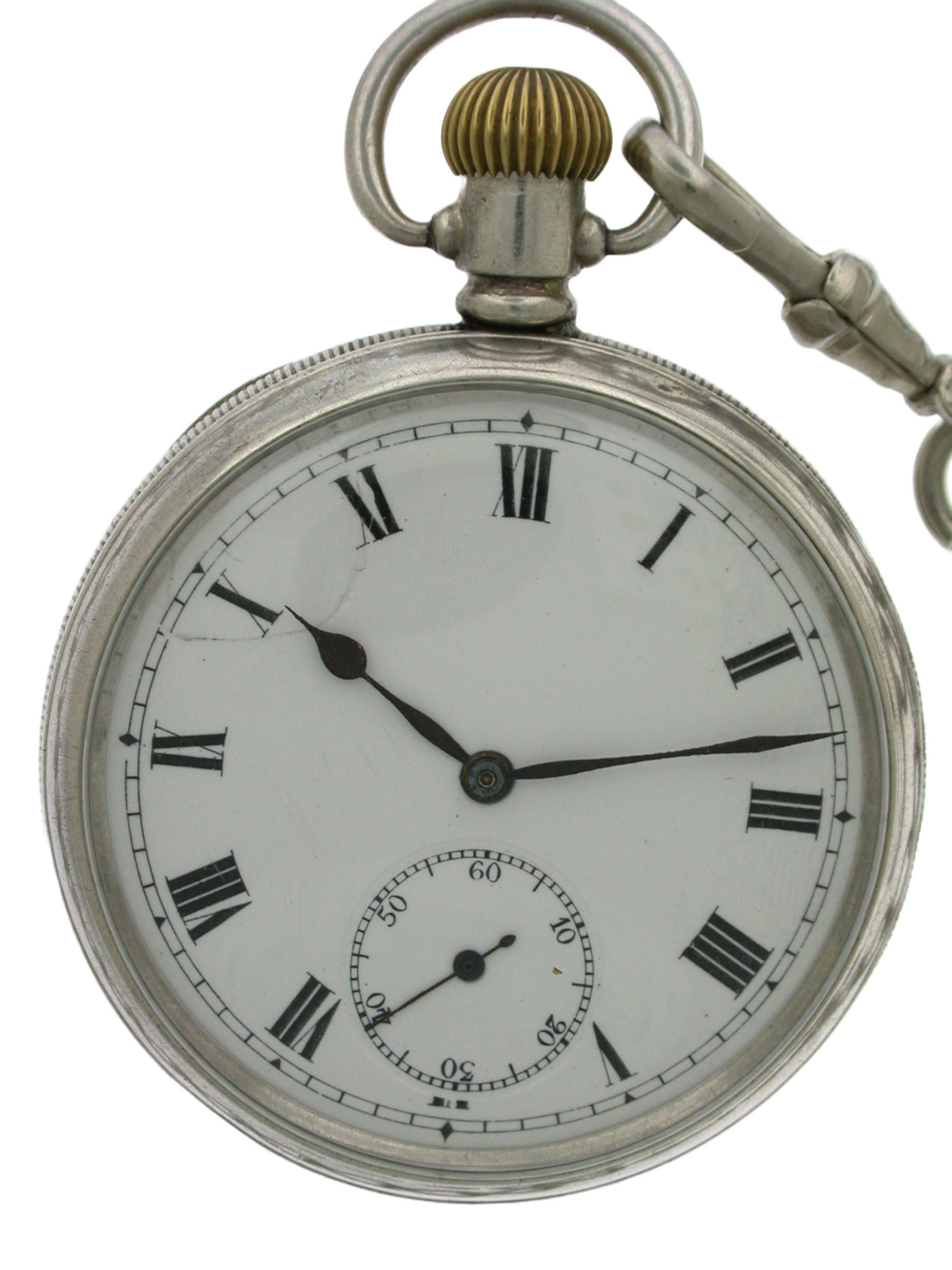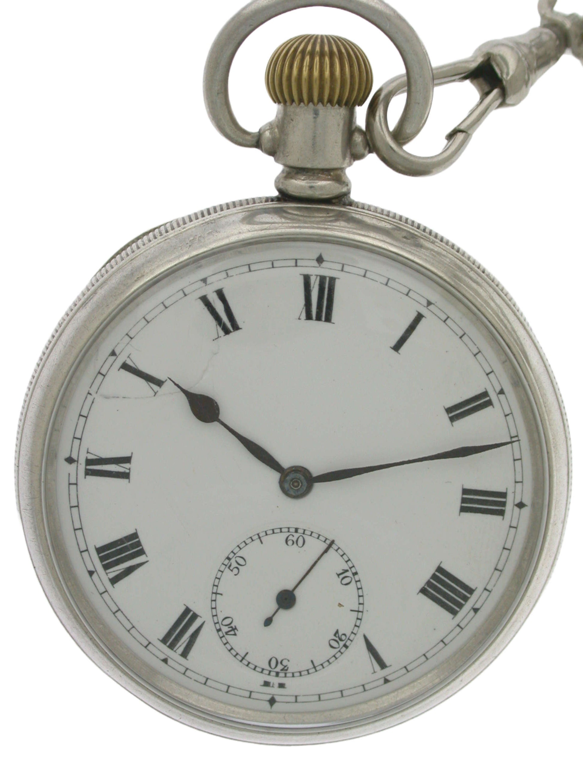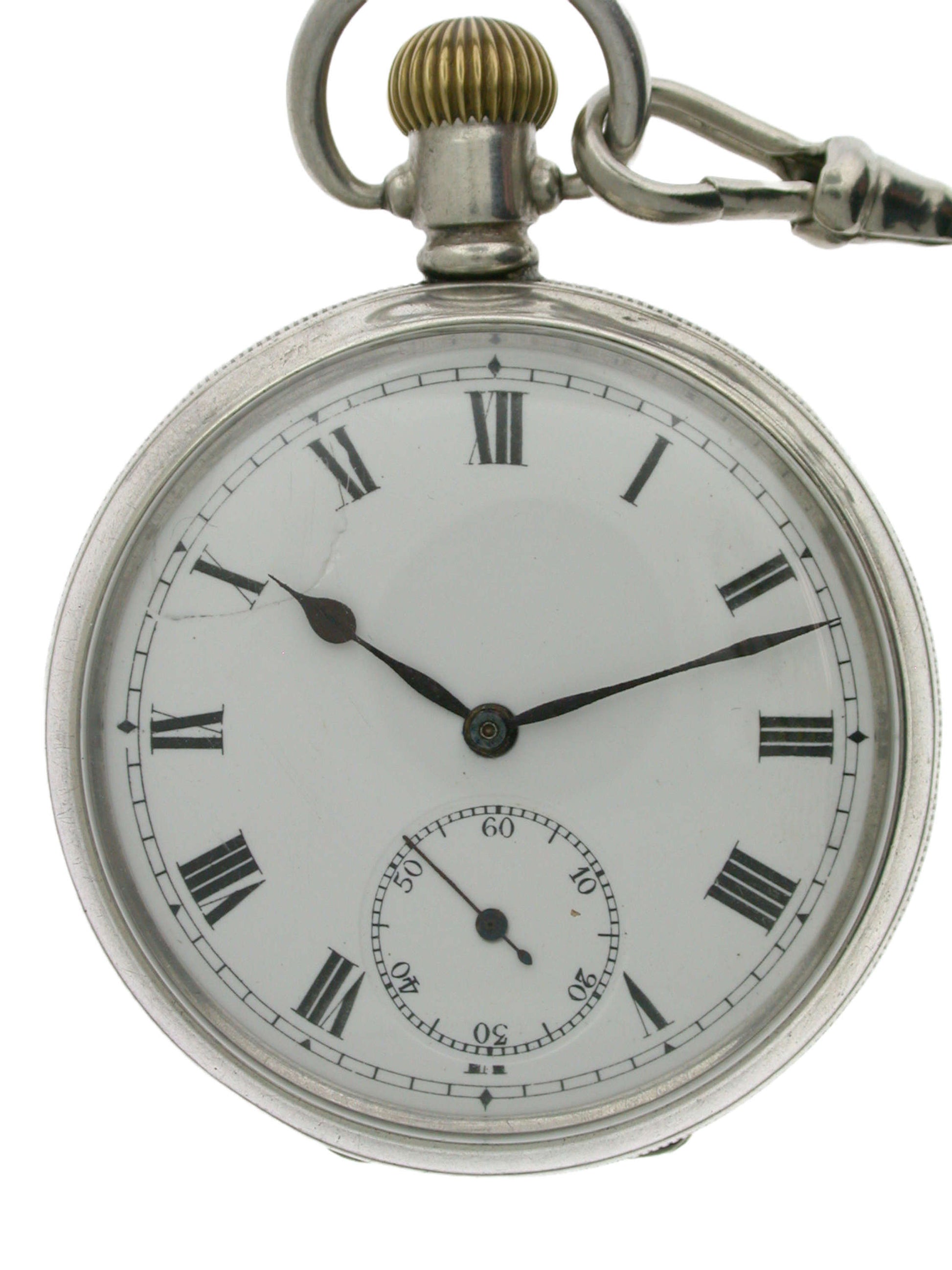 Dial: The white enamel dial has black Roman numerals with outer minute divisions. The dial has nice blued hands and a subsidiary second’s dial at the six. There is a chip between the ten and eleven.
