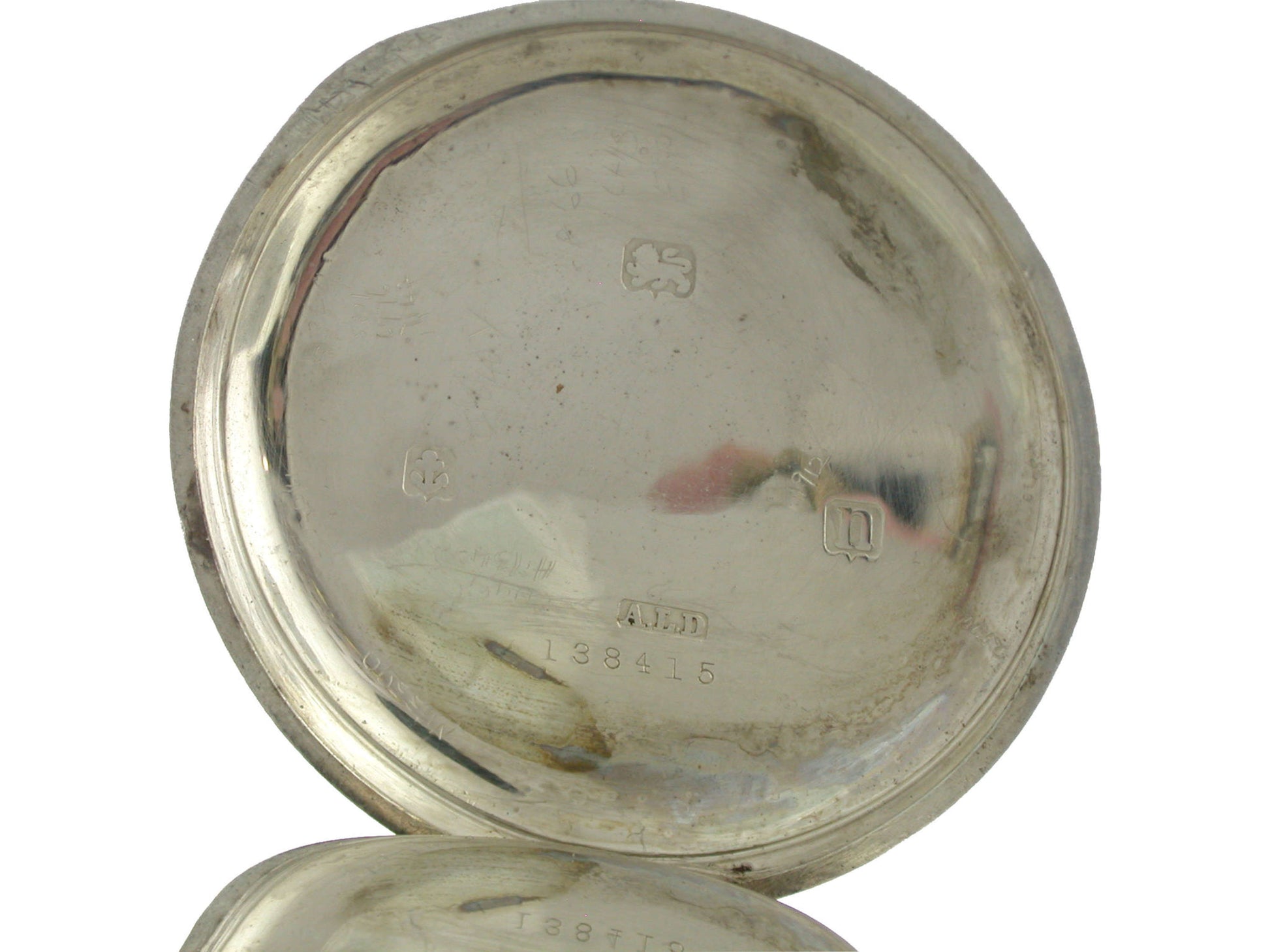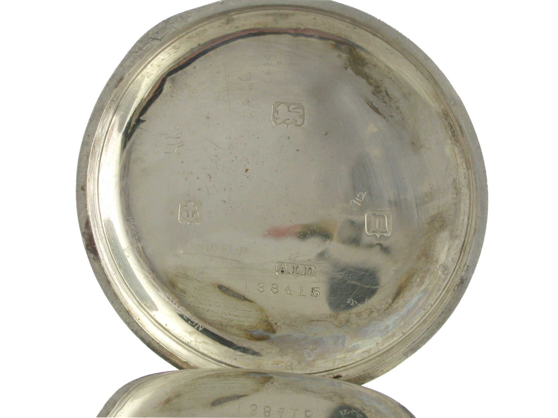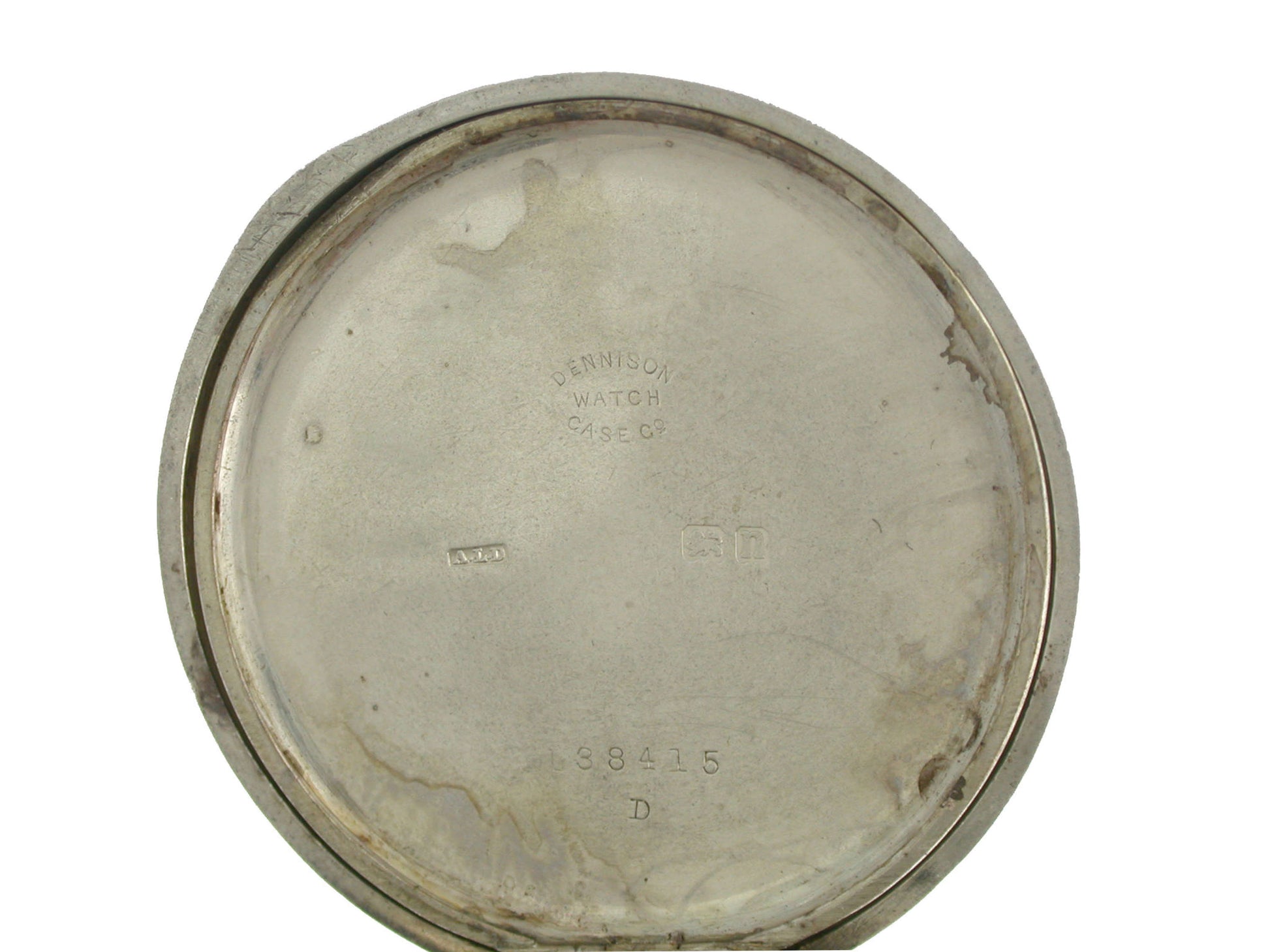 Case: The pocket watch lies in a silver ALD case with a rubbed engine turned finish and a monogram free cartouche. The inner side of the case is hallmarked for Silver Birmingham 1912. The cuvette and inner side of the case are both stamped ALD and numbered: 138415. The inner side of the cuvette is signed: Dennison Watch Co.