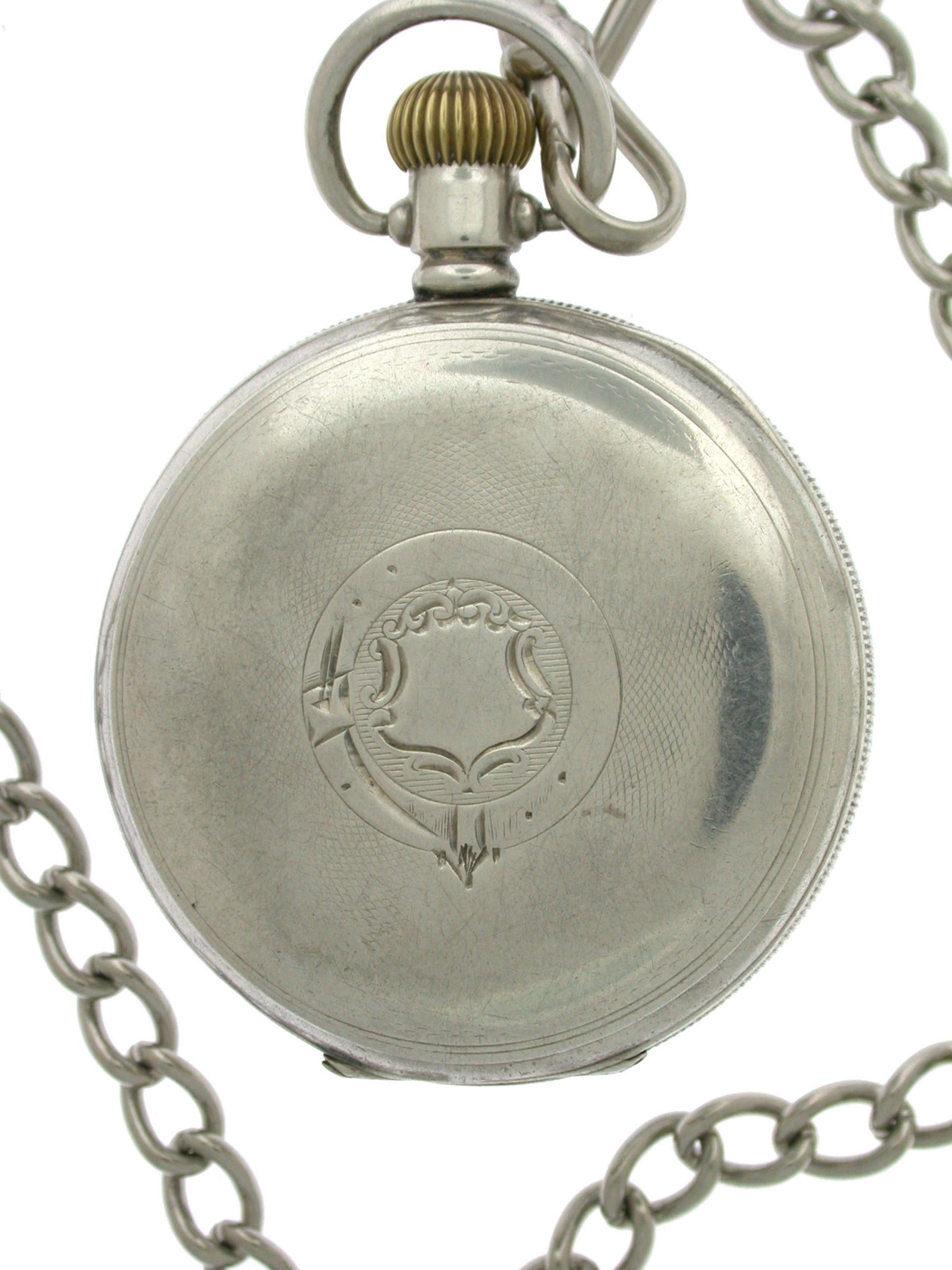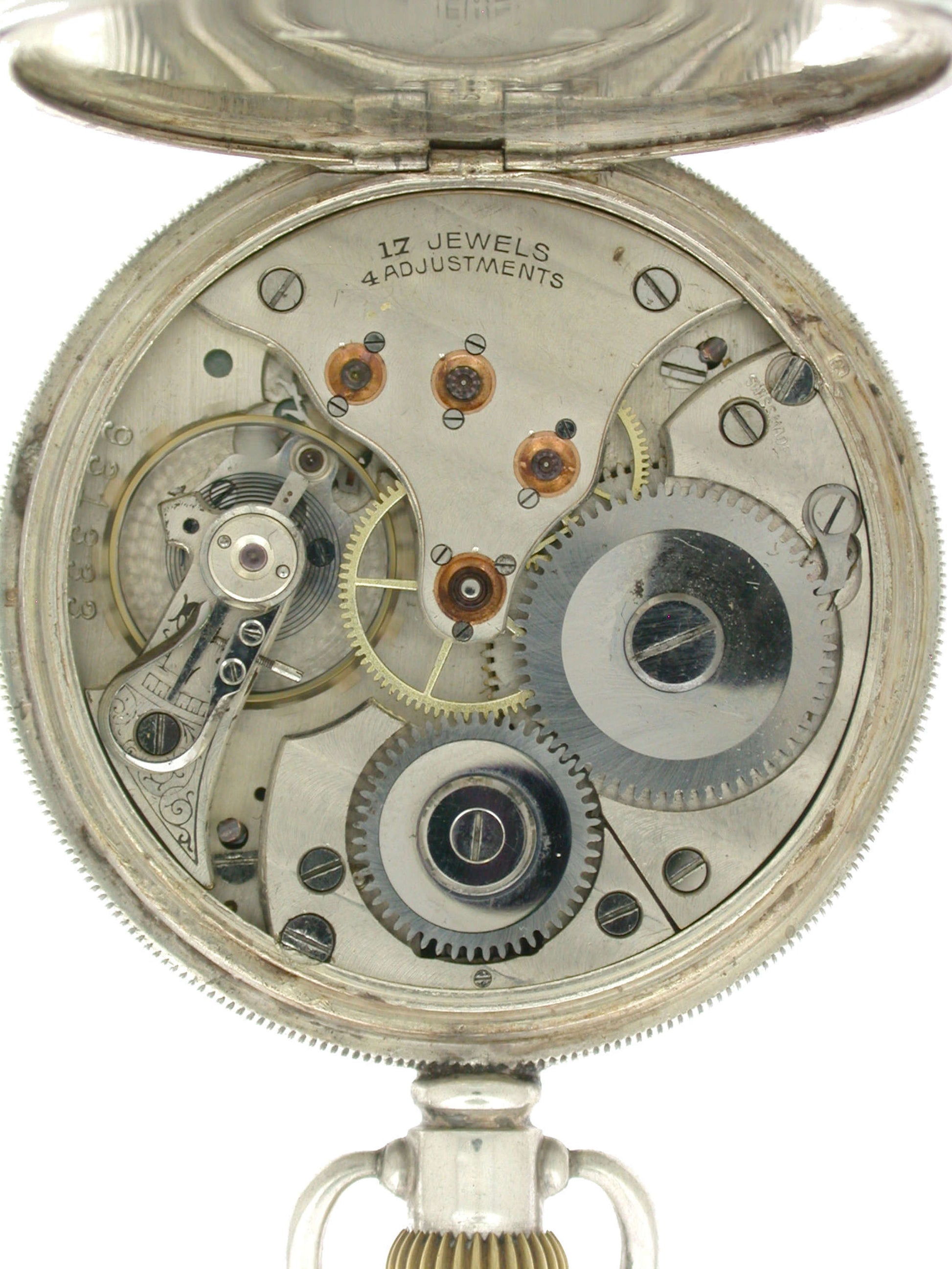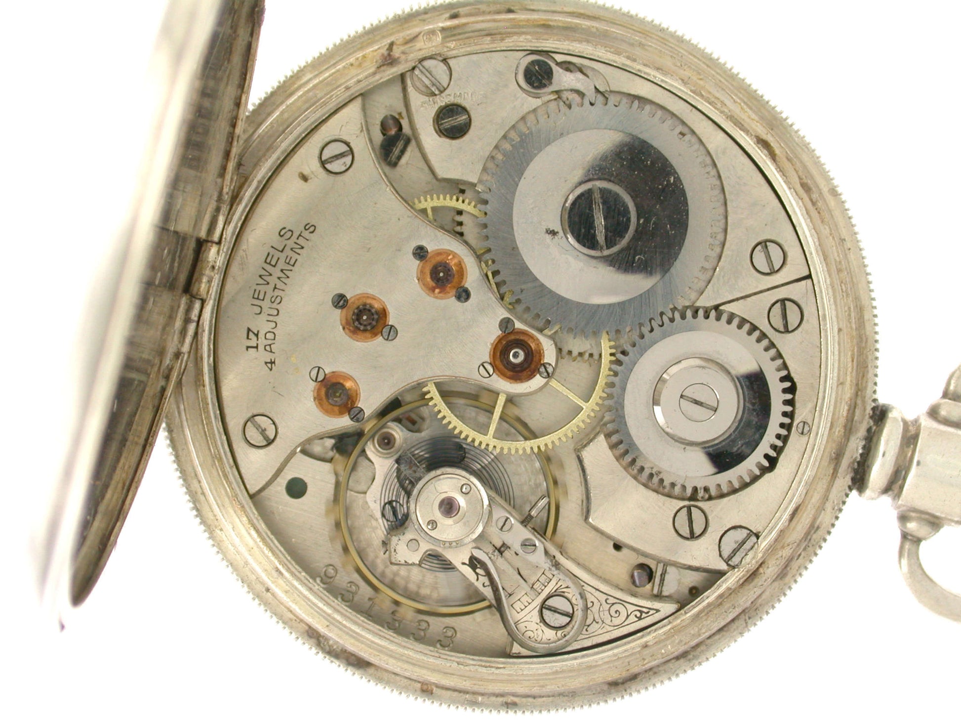 Movement: The anchor lever movement is fully screwed and has a swan regulator. The high-quality Swiss movement is in good working condition; however, we cannot guarantee accuracy for an antique pocket watch. The movement is signed: “17 Jewels, 4 adjustments, Swiss Made” and numbered: 931333.